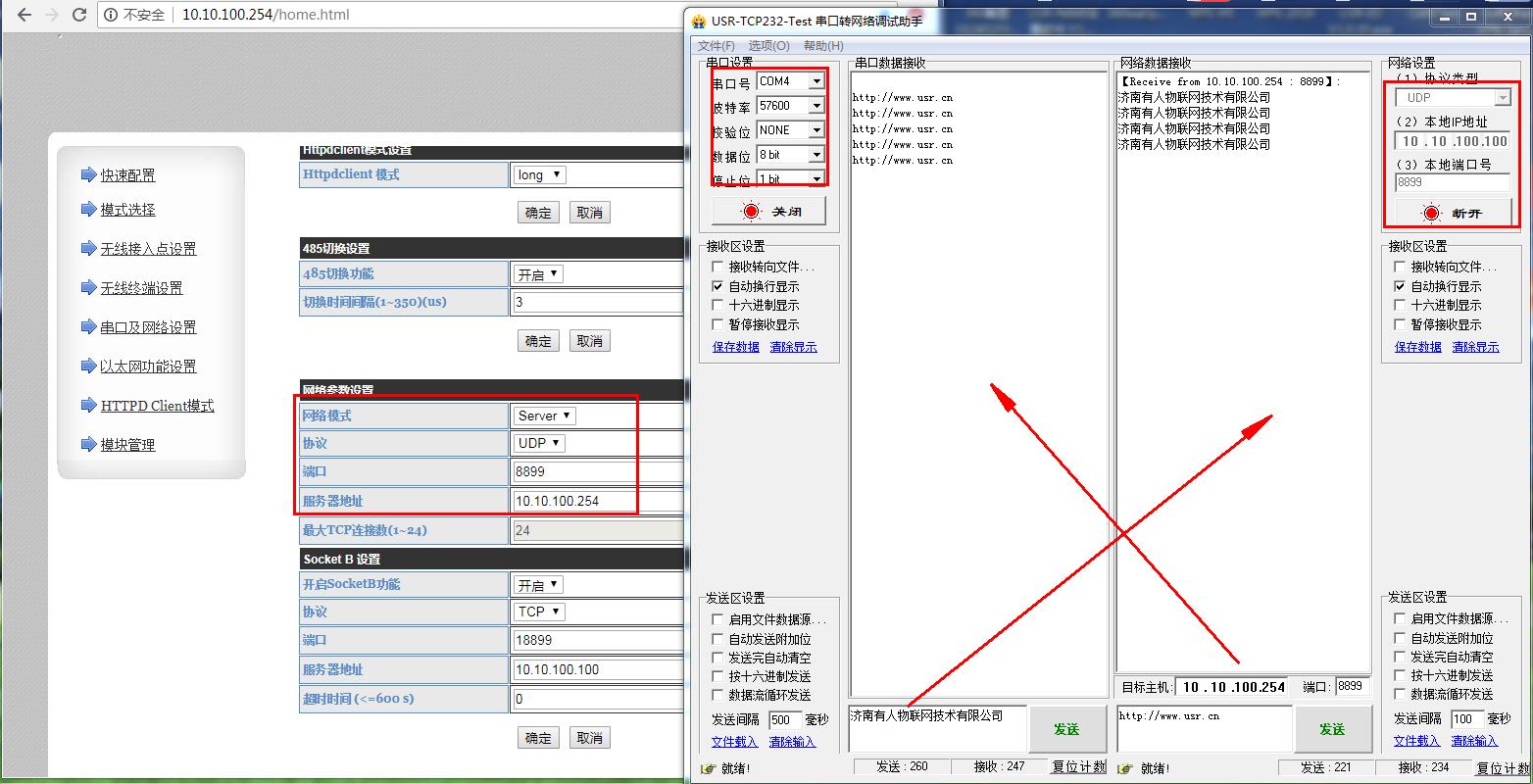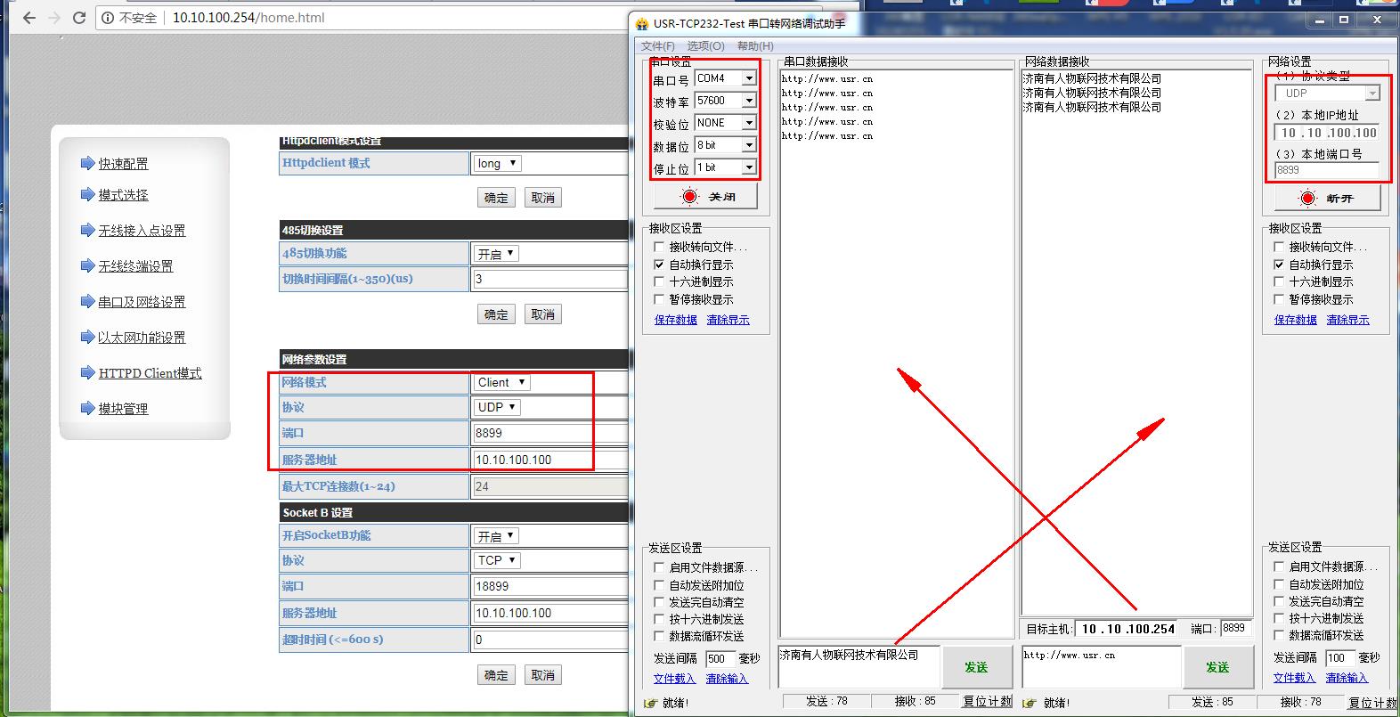 打開USR-TCP232-TEST網絡助手,左側串口部分用COM4打開,串口參數和DR404設置一致,網絡端設置UDP,本機IP填電腦的IP 10.10.100.100,本地端口填8899。