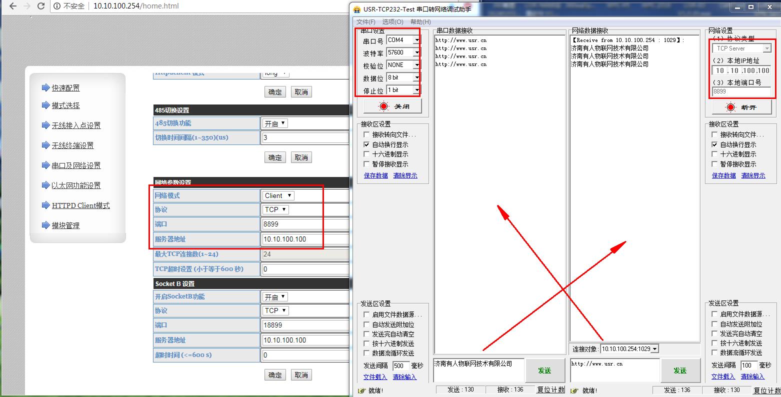 打開USR-TCP232-TEST網絡助手,左側串口部分用COM4打開,串口參數和DR404設置一致,網絡端設置TCP server,本機IP填電腦的IP 10.10.100.100,本地端口填8899。