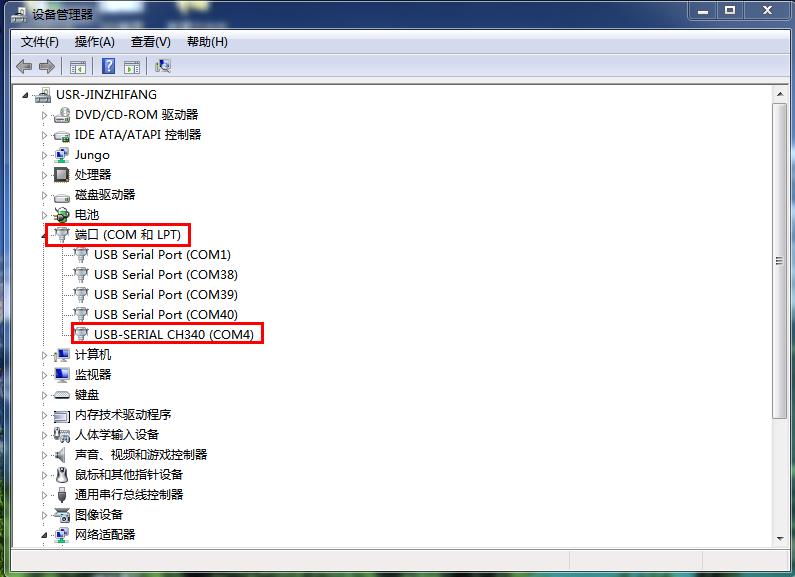 將USB-RS485串口線接電腦USB口,在電腦上設備管理器中,查看USB-RS485線的串口號,是COM4。