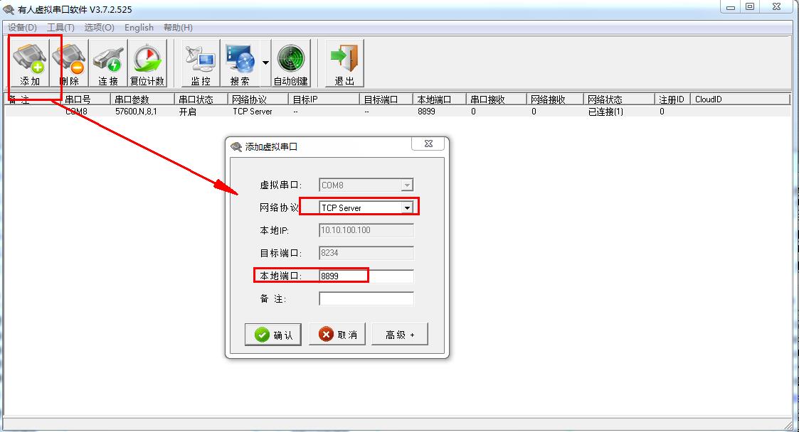 電腦關閉殺毒軟件和防火墻,下載并安裝虛擬串口軟件,手動添加一個COM口,做TCP server,端口8899。