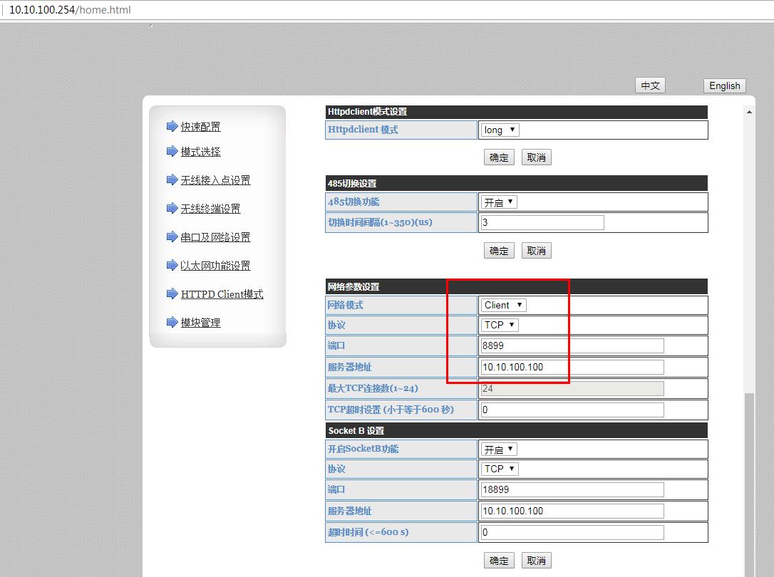 DR404在網頁上,串口及網絡設置,設置網絡模式TCP client,服務器IP填電腦IP10.10.100.100,端口填8899。保存參數,重啟DR404