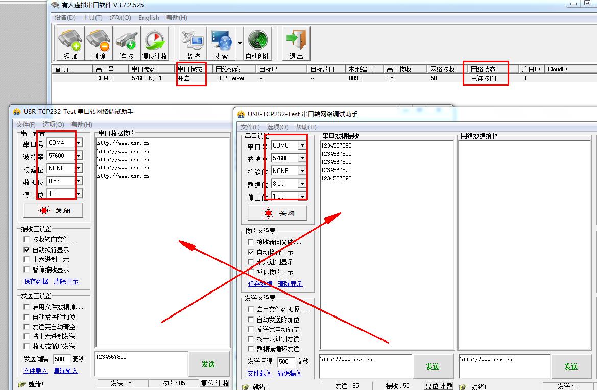 然后用兩個USR-TCP232-TEST測試串口和虛擬串口之間的數據傳輸。