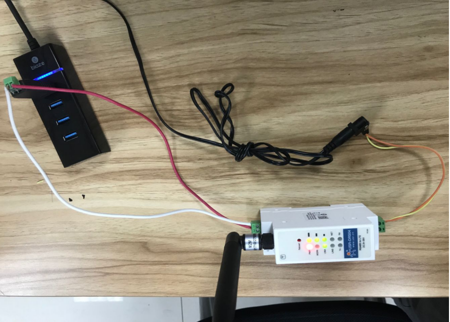 1. 硬件連接:裝上sim卡,sim卡依照圖1(1)的方式放入dtu當中。接上天線(4g天線),USR-DR504的串口通過USB轉485接到PC上,用我司提供的適配器供電,整個連接圖如圖1(2)所示。