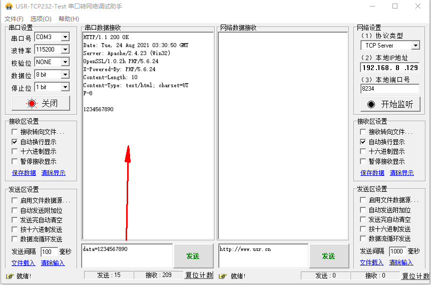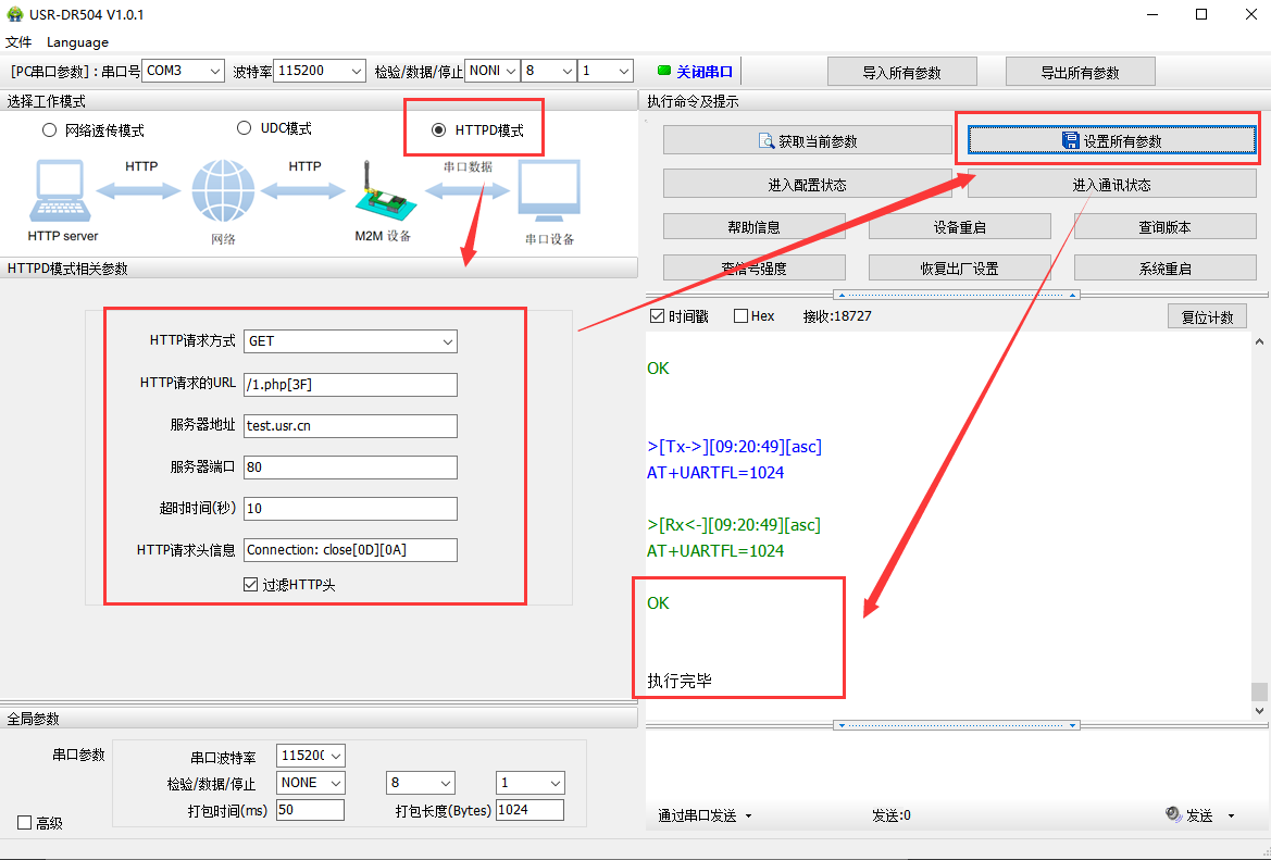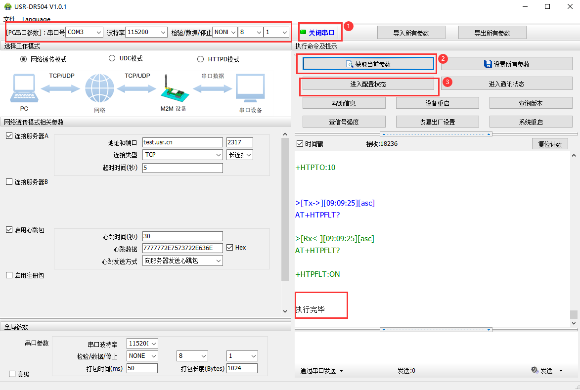 4. 打開串口后,先點擊進入配置狀態,如果模塊能返回+ok的字符,說明電腦和模塊連接是沒有問題的;然后點擊進入通訊狀態如圖,做數據通訊測試。如果不返回+OK的話,請參考(步驟3)