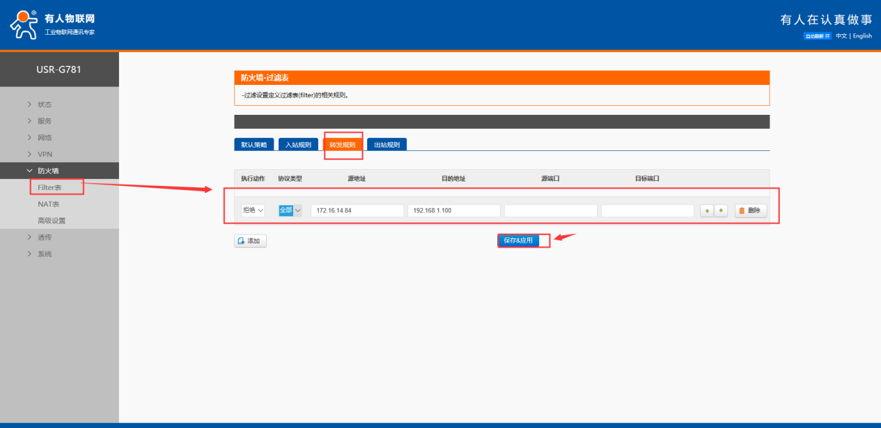 2、設置轉發規則,在防火墻---Filter表----轉發規則中設置