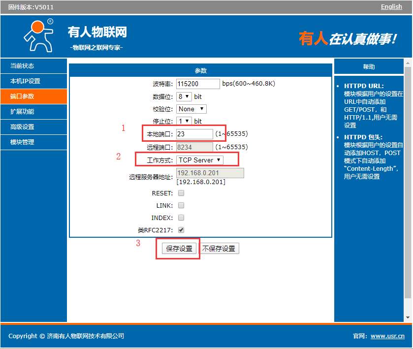 5、在“端口參數”設置處將301的工作模式設置成TCP-Server,本地端口23(端口可設,此處以23為例),設置完成后保存參數。