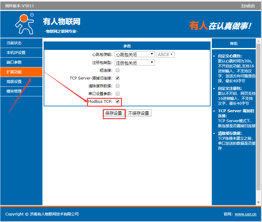 6、在“擴展功能”勾選“Modbus Tcp”,設置完成后點擊“保存設置”。