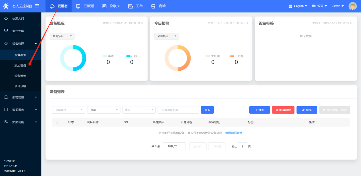 5、本次案例是C216連有人云進行數據顯示,可以進入云組態,選擇添加設備;