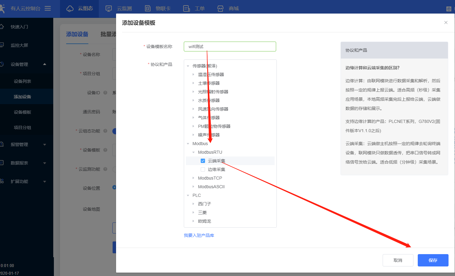 7、模板更改名稱,選擇modbus rtu協議,點擊保存