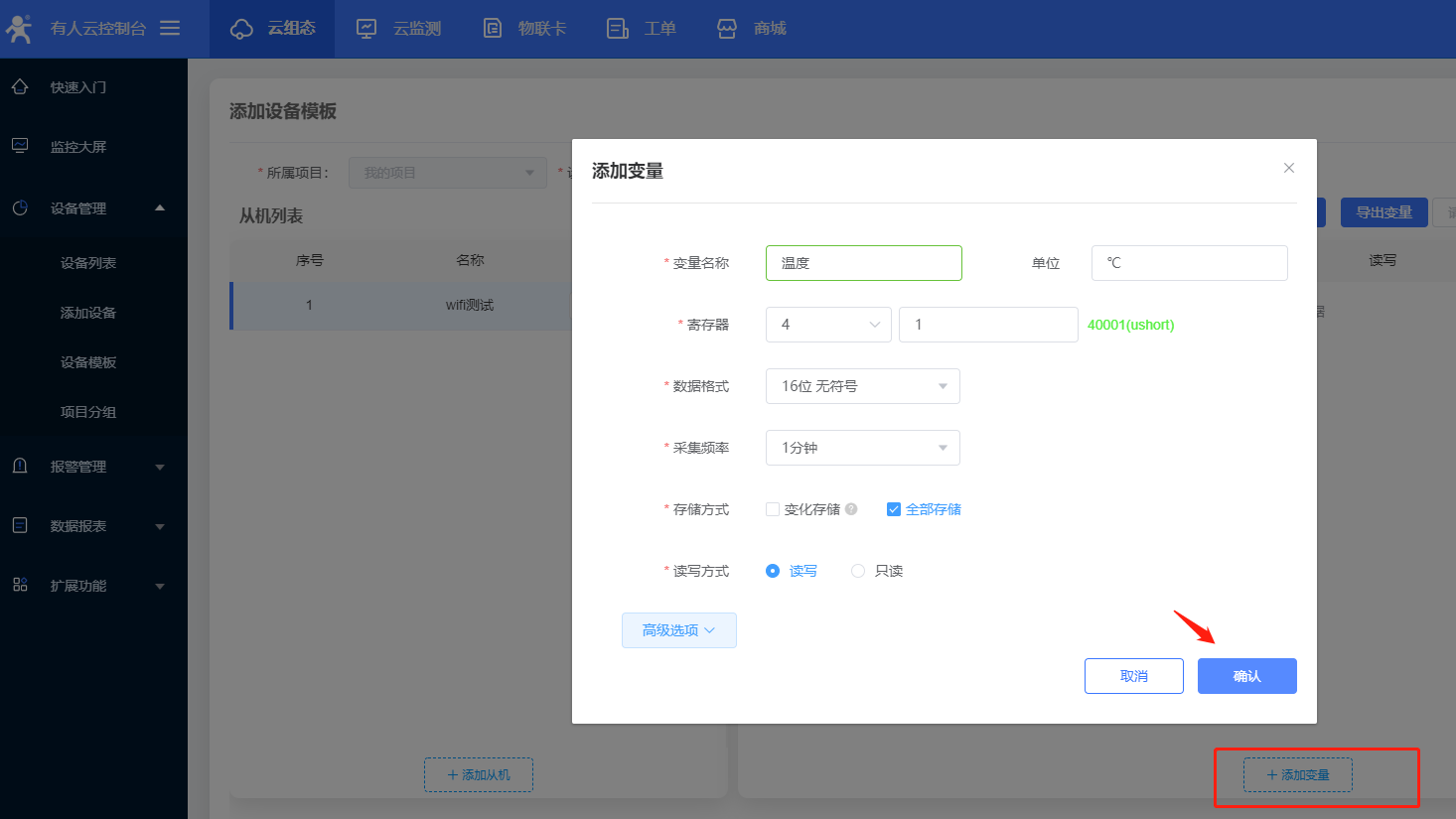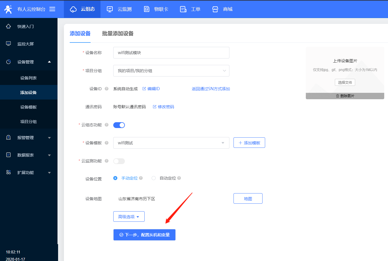 6、設置設備名稱,和項目分組,C216目前只能使用ID方式添加設備id;設備id和密碼設置默認就可以,選擇云組態,添加數據模板;