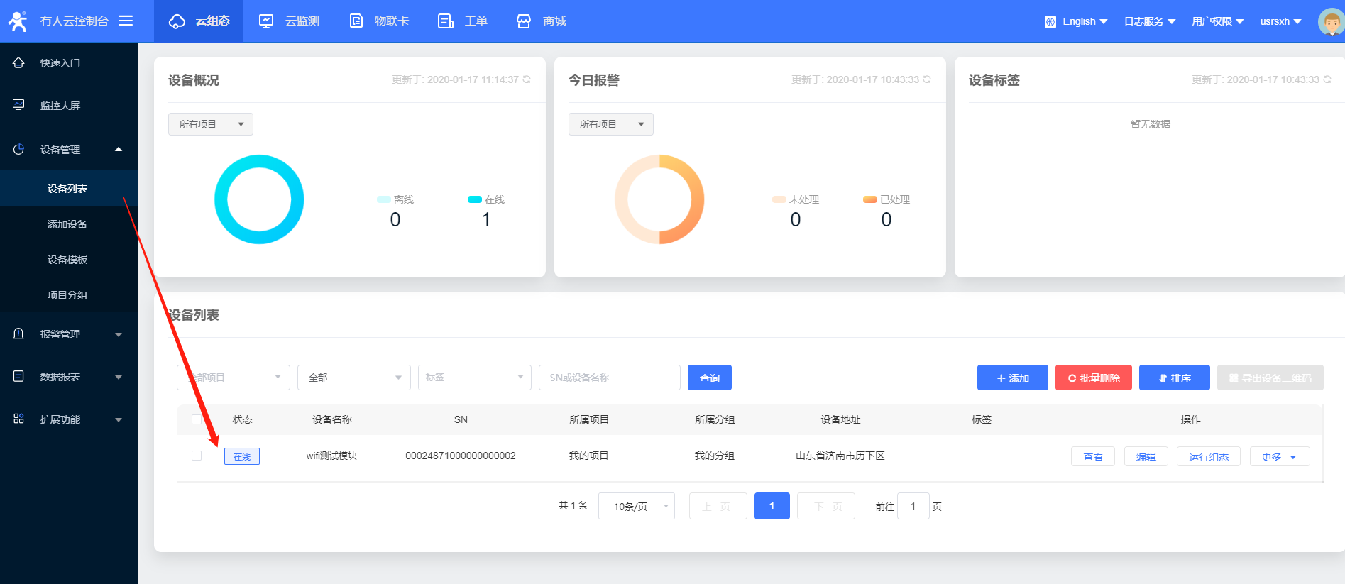 15、設置完所有的參數要重啟設備,稍等一會,在有人云界面,您會看到設備已經上線