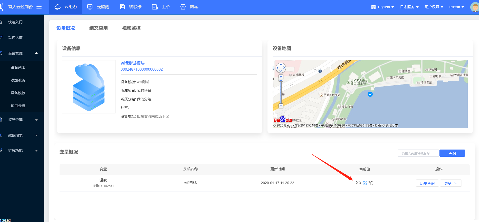 17、透傳云可以看到216上報的數據,數據采集頻率前面第10步配置的是1分鐘,所以數據會1分鐘采集一次,也可以點擊更多 - 主動采集,直接采集數據。