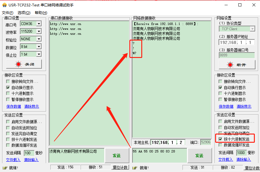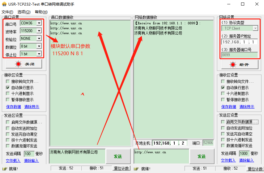 將模塊串口連接到電腦的串口,電腦的串口號為com36,電腦連接WiFi模塊的IP192.168.1.1,控制端口為8899.由于WiFi模塊默認為TCP server,所以電腦端連接模塊需要設置為TCP client連接模塊的server。