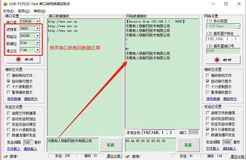 將模塊串口參數修改為9600、NONE、8、1, 需要網網絡端按十六進制下發55 AA 55 00 25 80 83 28, 發送完成后,軟件打開串口需要修改為9600、none、8、1, 不然數據會顯示為亂碼。 注意:本命令所作的修改立即生效,不需要重啟,當次有效,不會保存,斷電丟失。