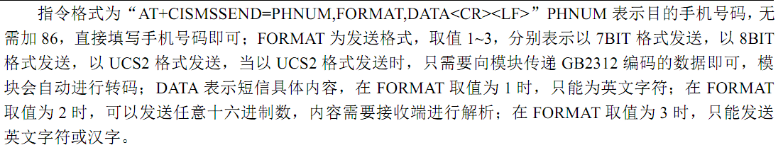 向NUM以FORMAT格式發送內容為DATA的英文短信,<CR><CL>表示回車換行,FORMAT取值為1/2/3,分別表示7BIT格式,8BIT格式,UCS2格式