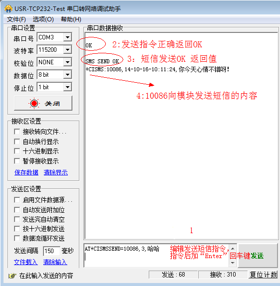 DTU在AT指令模式下支持標準的AT指令集,可以使用指令發送短信等,本文檔通過兩個例子說明使用AT指令發送短信: