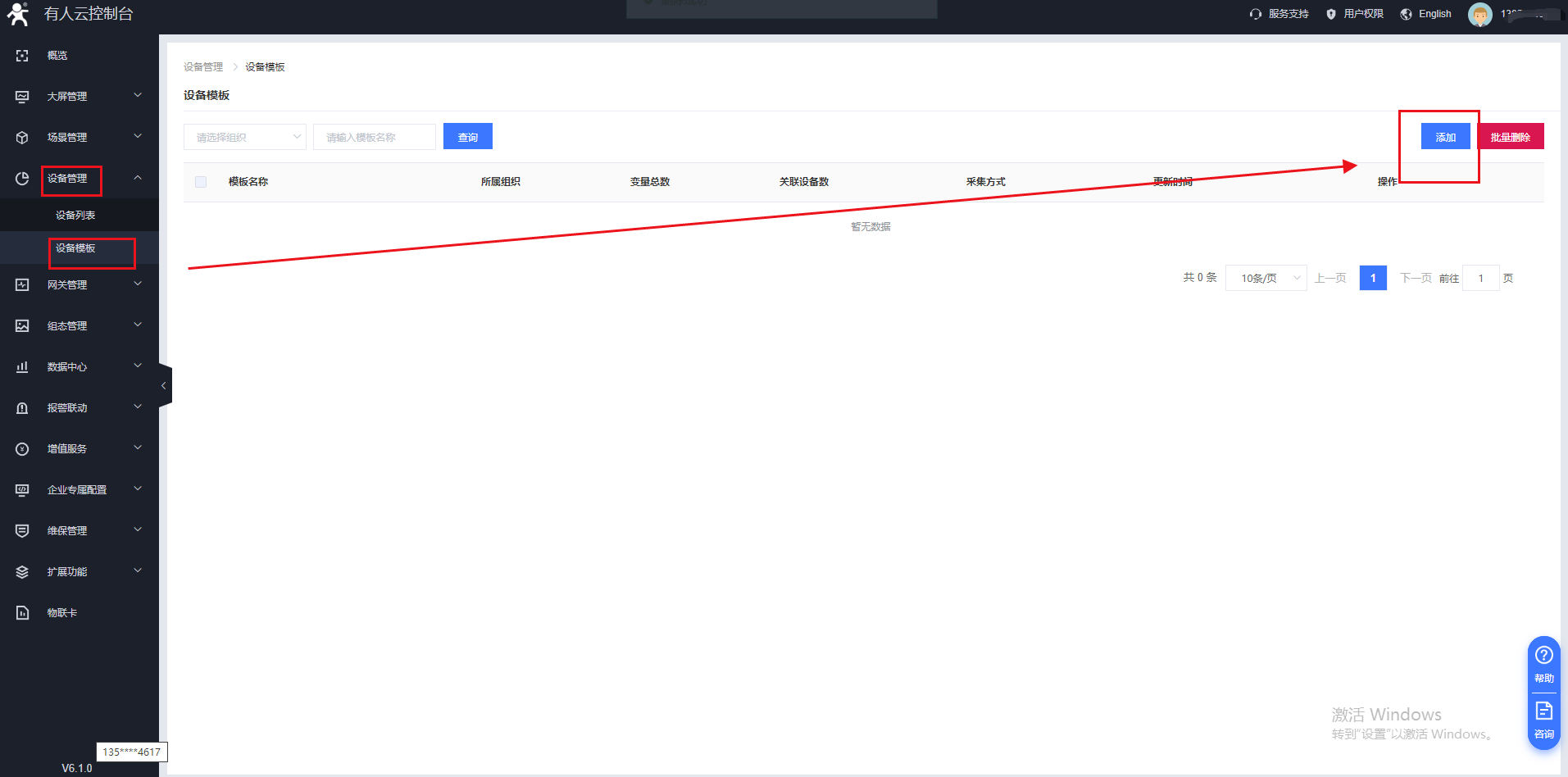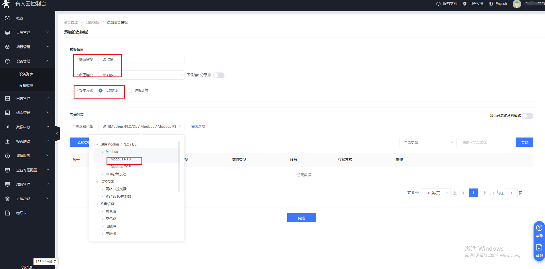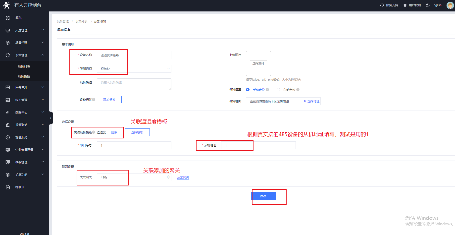7、在設備管理--設備列表的界面添加一個設備,把設備模板和網關進行關聯,并配置串口終端設備的從機地址。(測試從機地址設置為1)