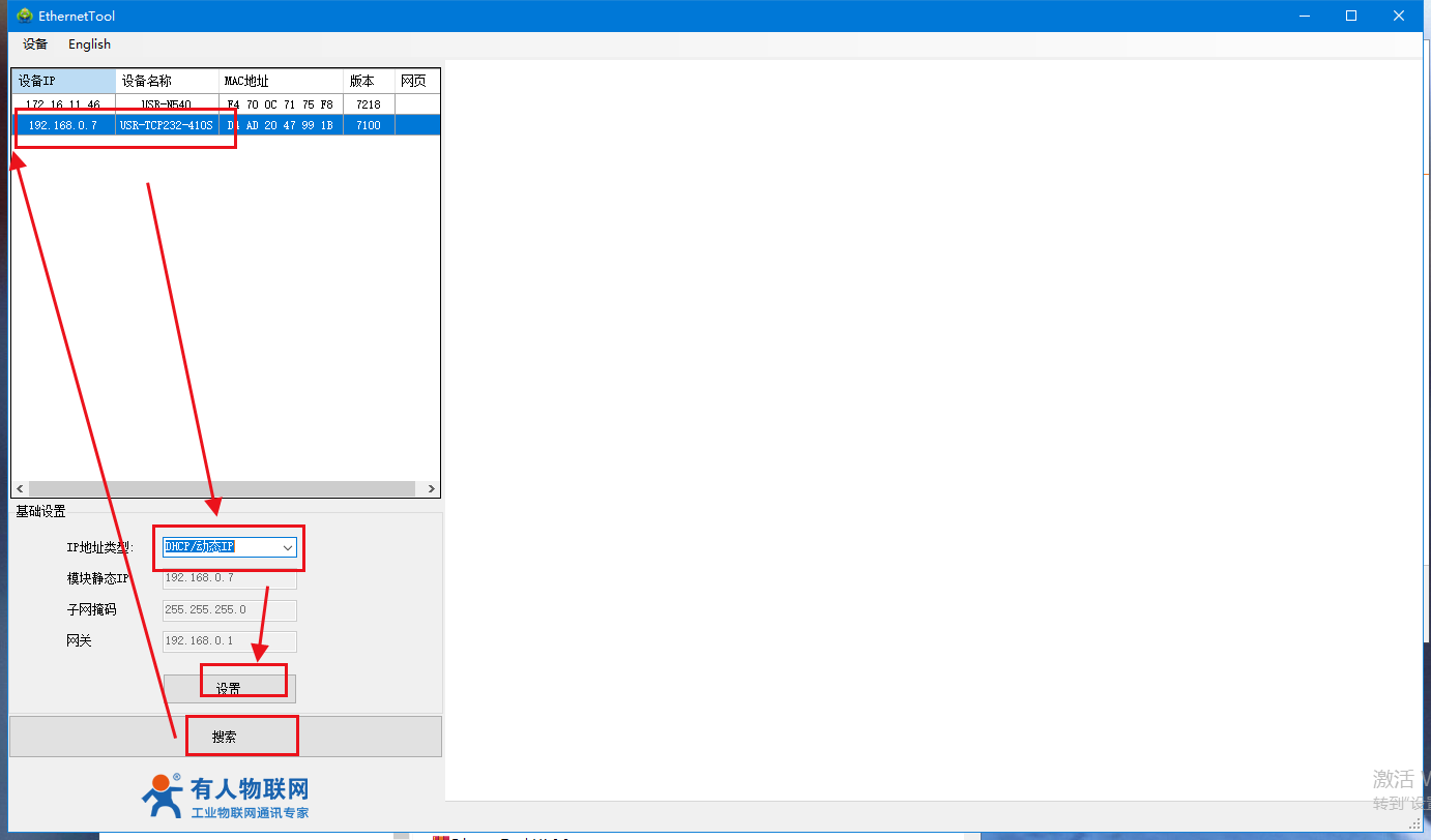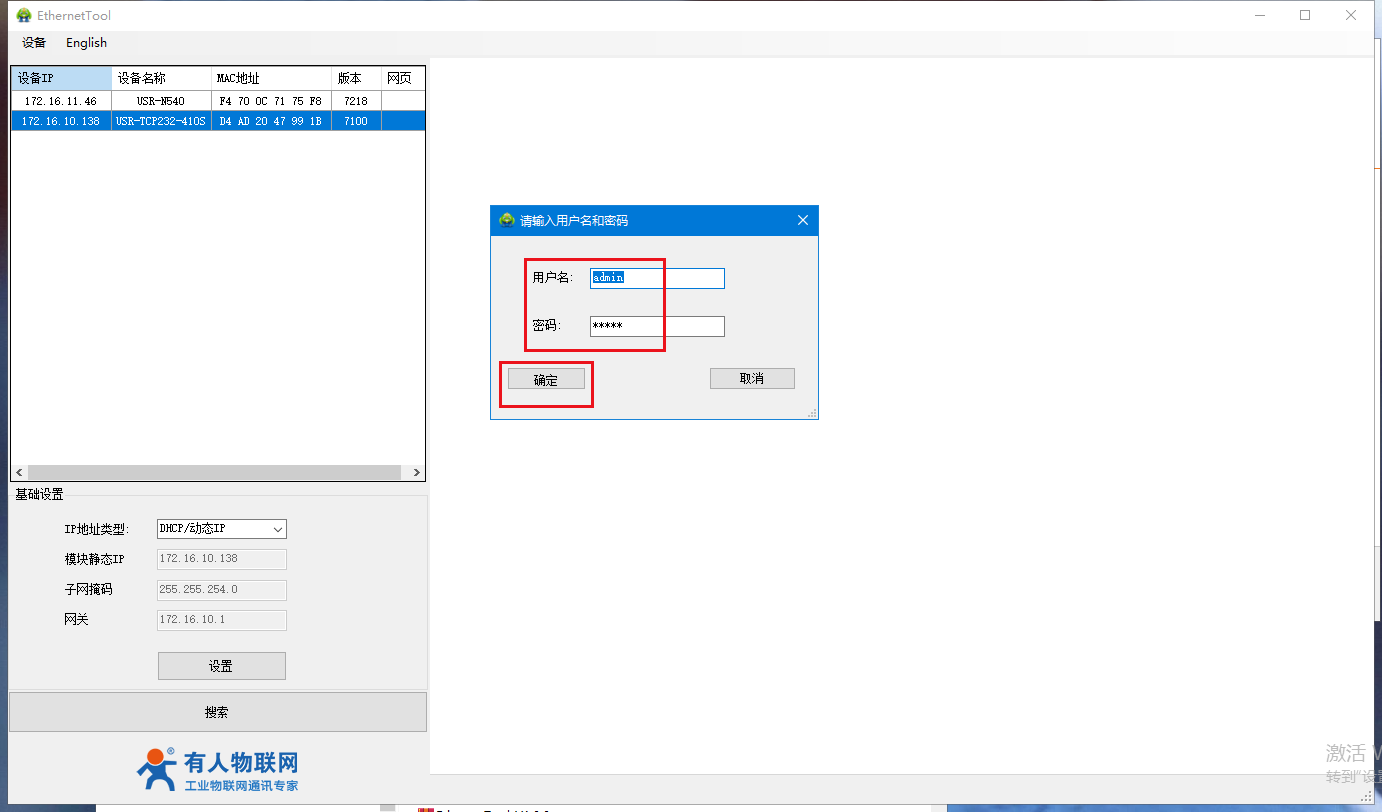2.打開H7設置軟件,當搜索列表中出現410s的設備后,單擊設備,ip設置為動態獲取DHCP,重新搜到設備,可以看到獲取的動態ip,然后選中,輸入用戶名和密碼都是admin,進入內置網頁。