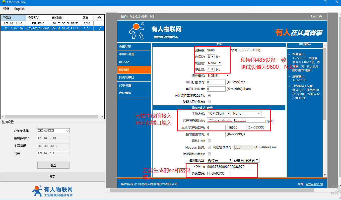 (3)配置485的串口參數,和接的485設備一致,工作方式選擇tcp client,把云端生成的接入地址和端口配置里面,開啟注冊包,選擇透傳云,把云端生成的sn和密碼配置里面,配置完保存重啟生效,云端可以看到410s在線