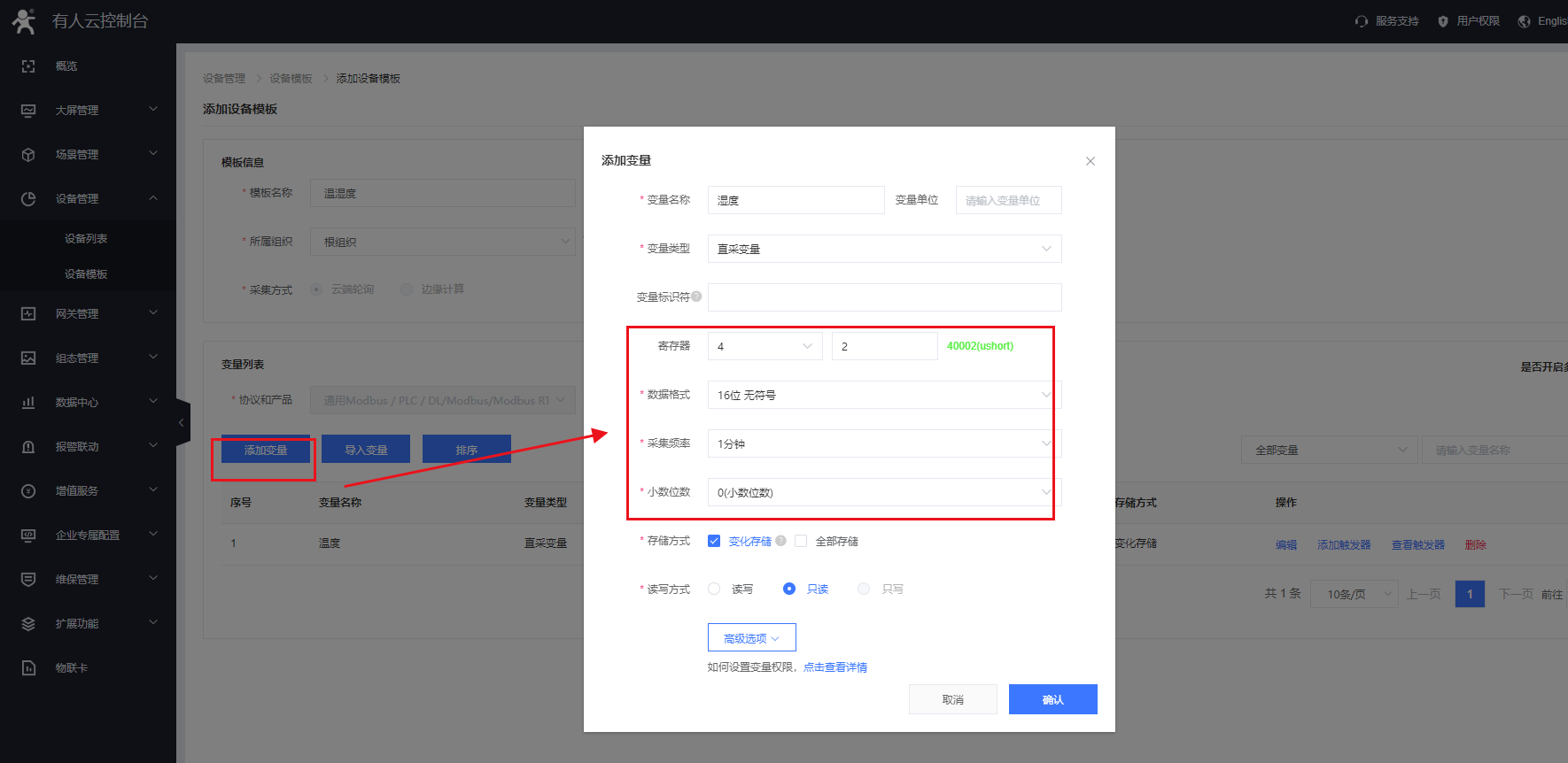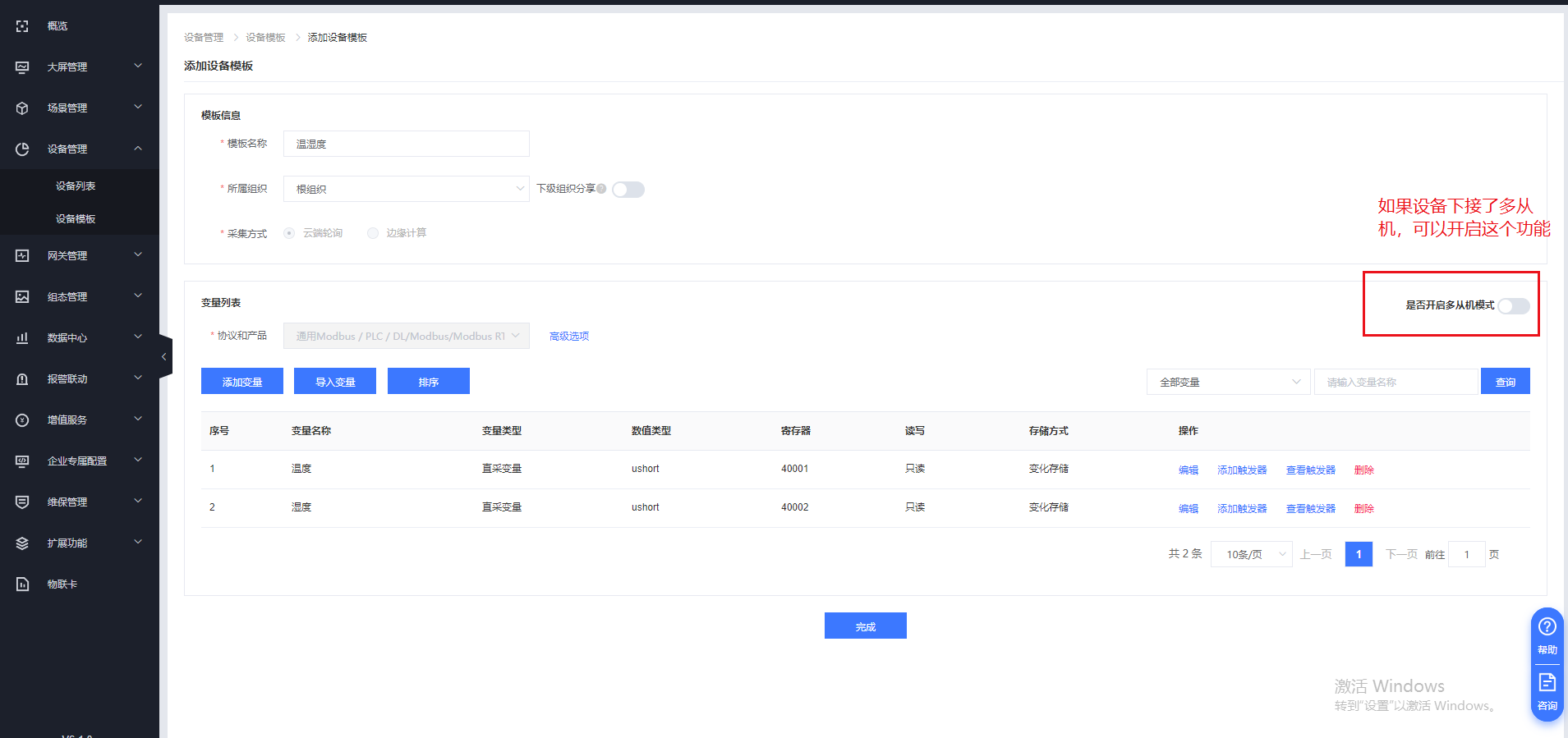 (2)在設備管理---設備模板界面添加需要采集的從機變量點。寄存器信息需要與串口設備進行匹配。(測試用modbus savle 軟件模擬modbus rtu485設備,采集變量40001、40002)