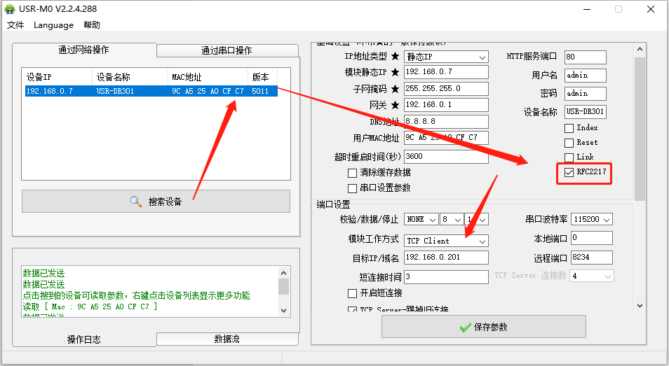 點擊“搜索設備”當搜索列表中出現301的設備后,單擊搜索到的設備,查看其配置信息,勾選RFC2217,其余配置可按照圖片設置。