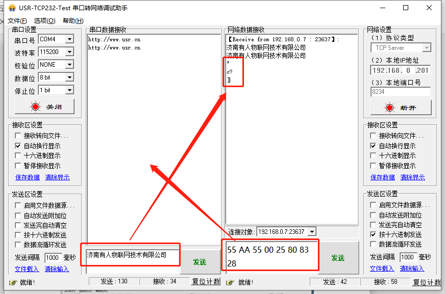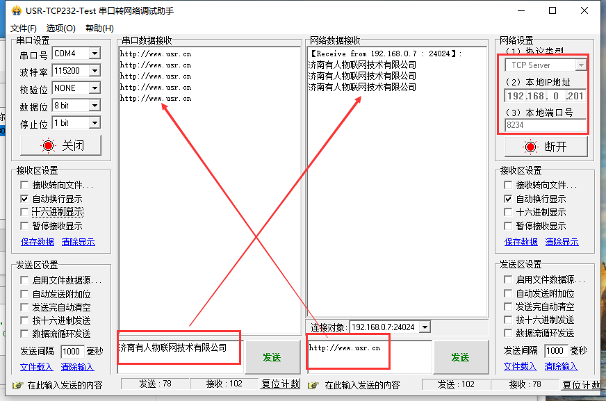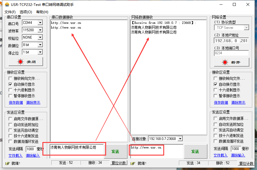 將軟件串口設置中的串口號配置為COM4。由于設備默認協議類型為TCP Client,所以電腦端連接設備需要設置為TCP server。服務器IP設置為電腦IP:192.168.0.201。端口號設置為301默認參數中的“連接目標端口”:8234