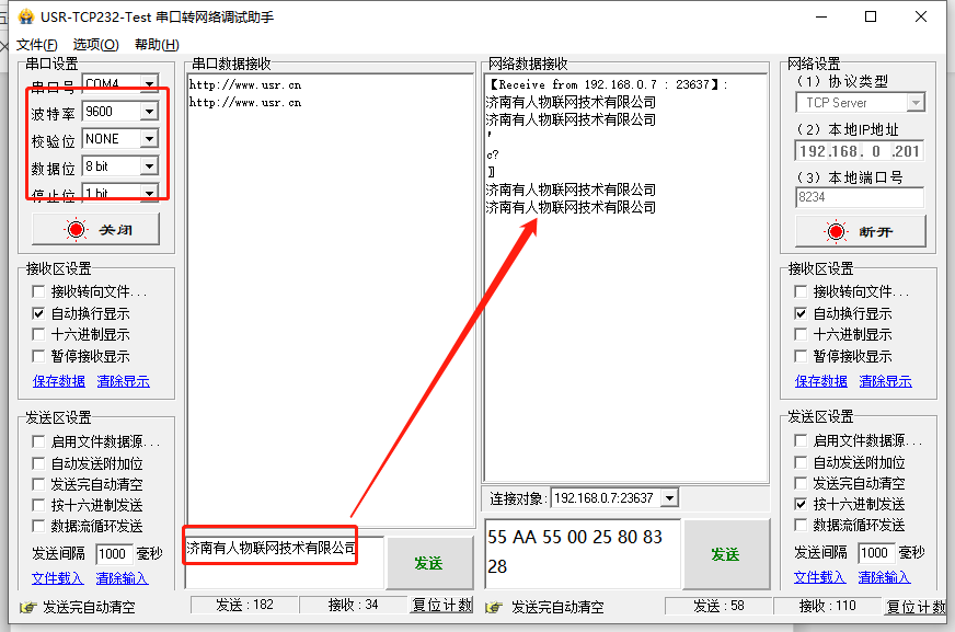 將模塊串口參數修改為9600、NONE、8、1,需要網網絡端按十六進制下發55 AA 55 00 25 80 83 28,發送完成后,軟件打開串口需要修改為9600、NONE、8、1, 不然數據會顯示為亂碼。