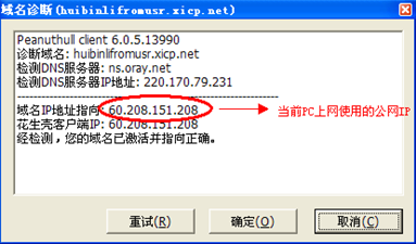 分配了動態域名huibinlifromusr.xicp.net,右鍵后點擊“域名診斷”,相關信息如下