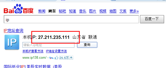 1) 如果您只是想測試一下,可以不用申請動態域名,直接用自己當前的動態IP即可。像這樣查一下自己的當前IP。其中可以看到自己的當前公網IP為27.211.235.111(這個IP是動態的,對應上面申請的域名)。