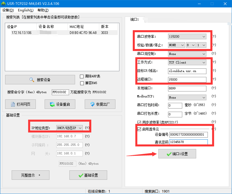 4、設置參數:將工作方式 ,遠程服務器地址和遠程端口分別設置為:TCp client、clouddata.usr.cn、15000