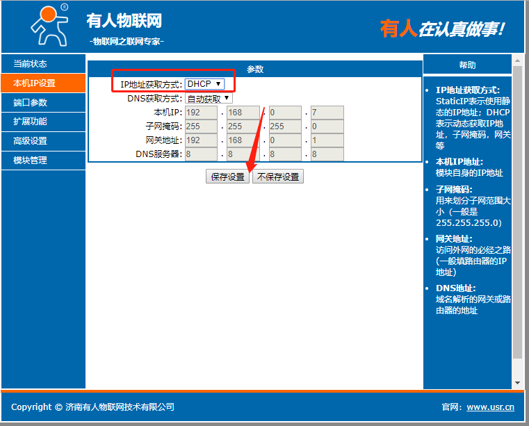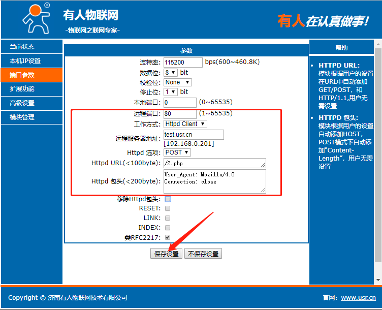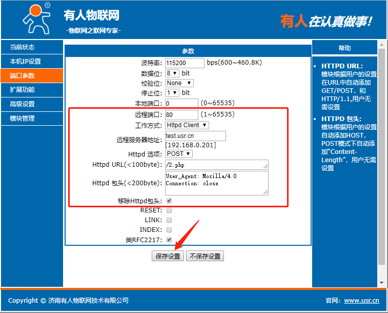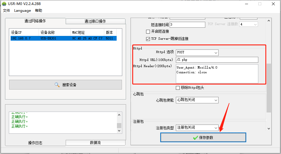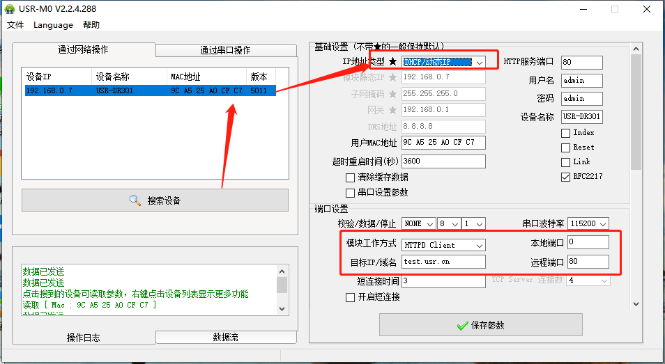 點(diǎn)擊“搜索設(shè)備”當(dāng)搜索列表中出現(xiàn)301的設(shè)備后,單擊搜索到的設(shè)備,IP設(shè)置為DHCP,模塊設(shè)置為Httpd Client模式,請(qǐng)求方式POST,URL為/2.php,設(shè)置服務(wù)器地址test.usr.cn,端口80,設(shè)置并保存所有參數(shù),重啟模塊。(本說明文檔使用為有人測(cè)試服務(wù)器)