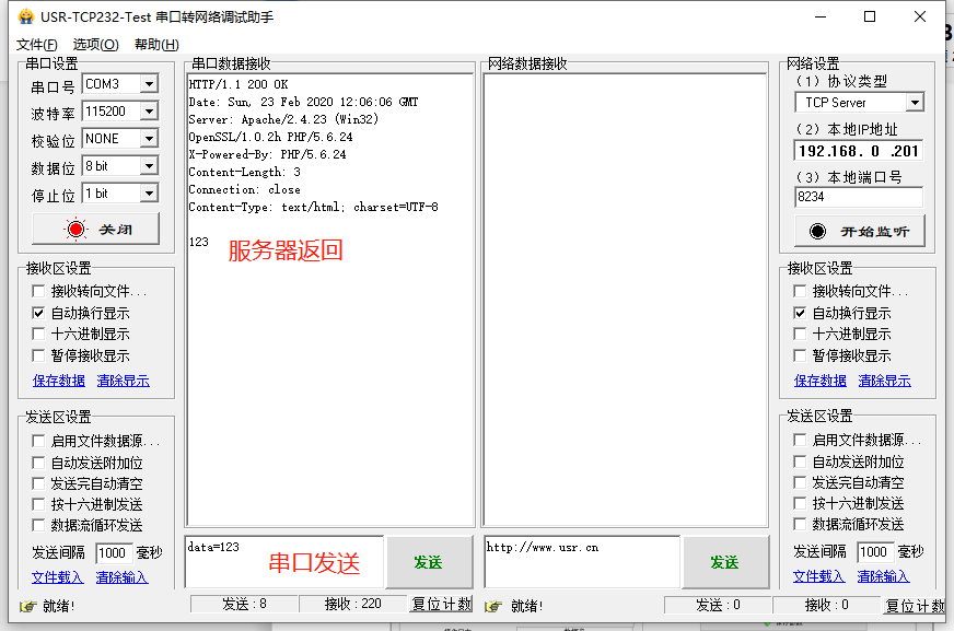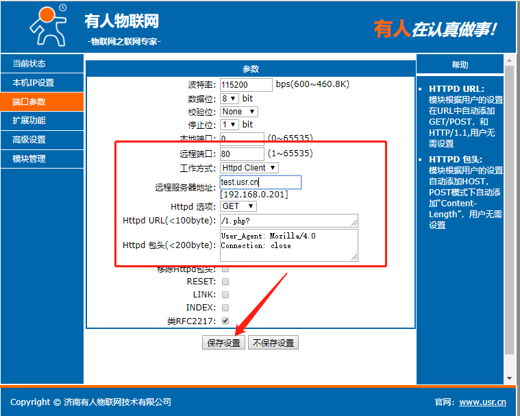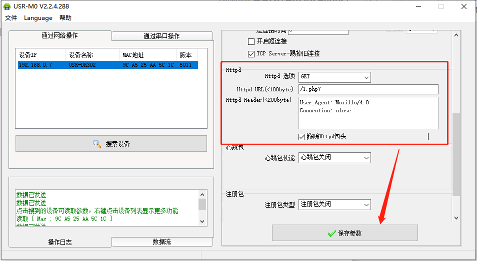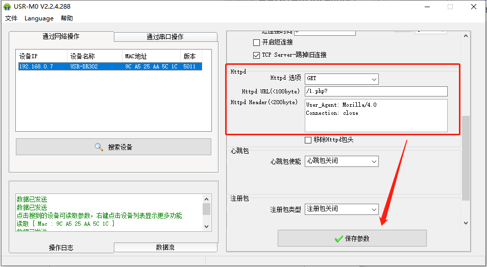 點(diǎn)擊“搜索設(shè)備”當(dāng)搜索列表中出現(xiàn)301的設(shè)備后,單擊搜索到的設(shè)備,IP設(shè)置為DHCP,模塊設(shè)置為Httpd Client模式,請(qǐng)求方式GET,URL為/1.php?,設(shè)置服務(wù)器地址test.usr.cn,端口80,設(shè)置并保存所有參數(shù),重啟模塊。(本說明文檔使用為有人測(cè)試服務(wù)器)