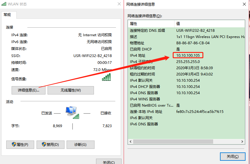 (2) 連接成功后或者電腦獲取到IP:10.10.100.105, 電腦把wifi之外的網(wǎng)卡禁用。