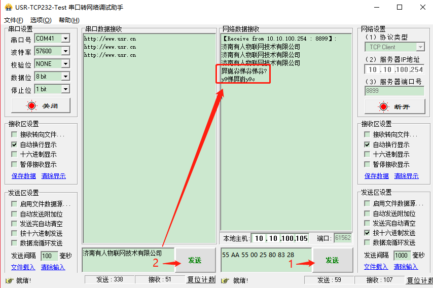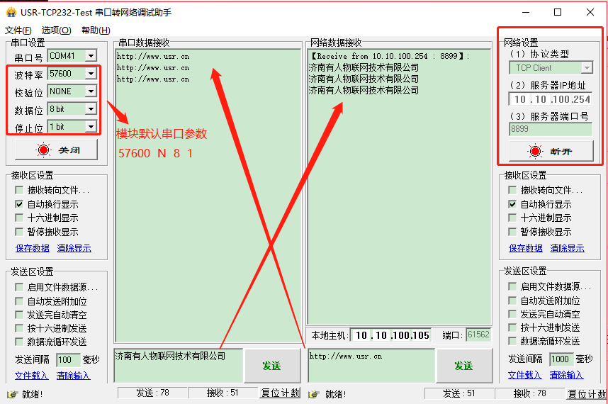 將模塊串口連接到電腦的串口,電腦的串口號(hào)為com41,電腦連接WiFi模塊的IP10.10.100.254,控制端口為8899.由于WiFi模塊默認(rèn)為TCP server,所以電腦端連接模塊需要設(shè)置為TCP client連接模塊的server。