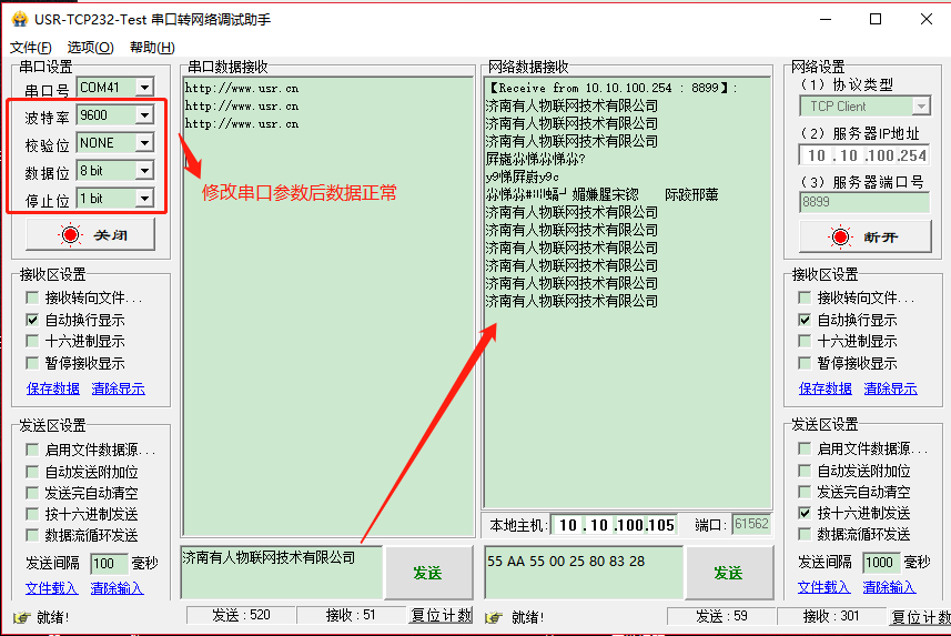 將模塊串口參數(shù)修改為9600、NONE、8、1, 需要網(wǎng)網(wǎng)絡(luò)端按十六進(jìn)制下發(fā)55 AA 55 00 25 80 83 28, 發(fā)送完成后,軟件打開串口需要修改為9600、none、8、1, 不然數(shù)據(jù)會(huì)顯示為亂碼。 注意:本命令所作的修改立即生效,不需要重啟,當(dāng)次有效,不會(huì)保存,斷電丟失。