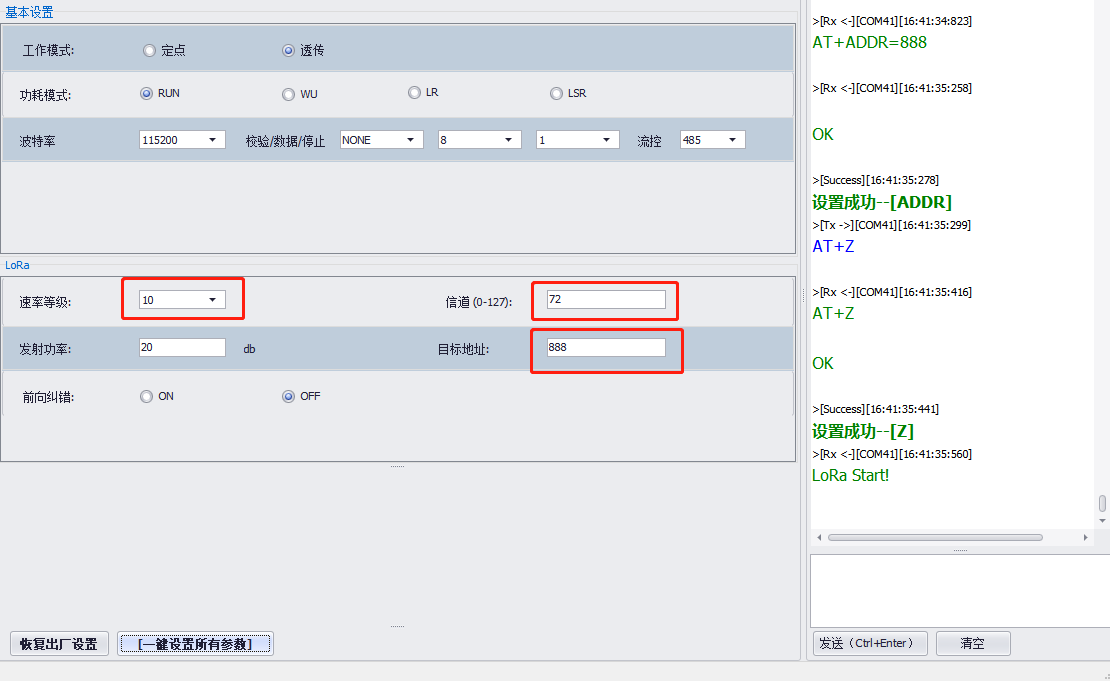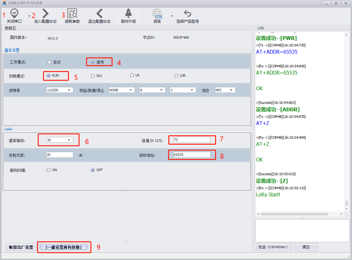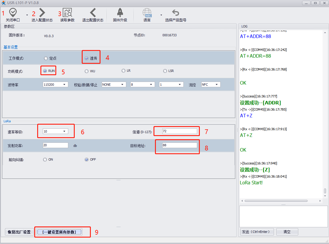 打開LoRa設置軟件(102-P設備選擇L101-P打開軟件),依次點擊打開串口(選擇A、B對應的串口號,串口參數:115200,None,8,1,NFC)、進入配置狀態、讀取參數、配置上表中的參數、一鍵設置所有參數,關閉LoRa設置軟件。