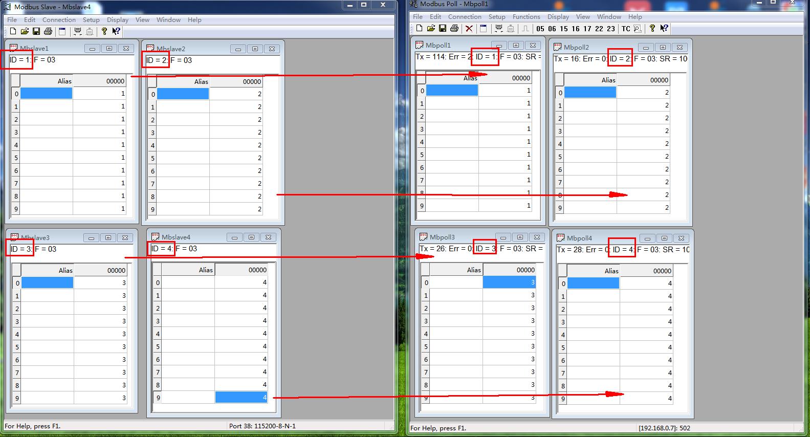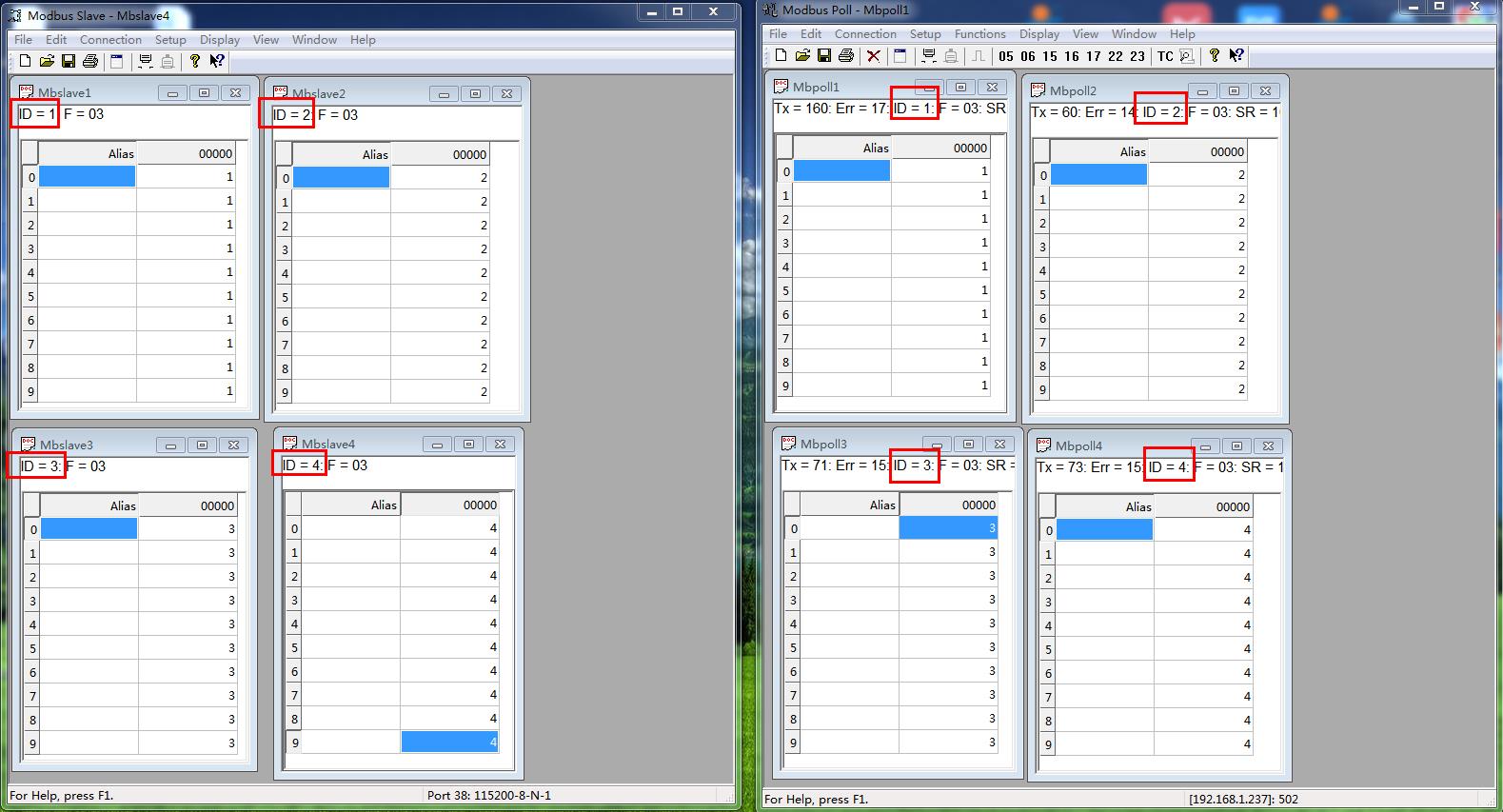 MODBUS POLL軟件對應添加4個SLAVE ID,依次是ID 1 ID 2 ID 3 ID 4。