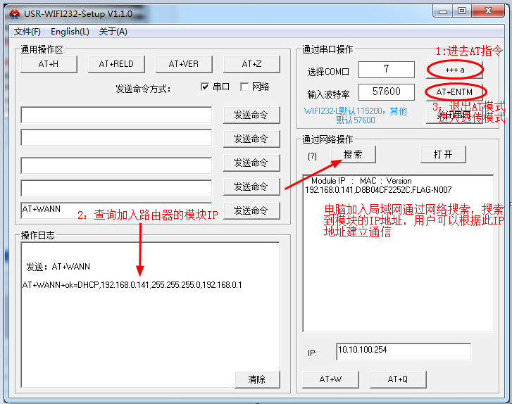 串口AT指令模式查詢模塊加入路由器之后自動獲取的IP地址:查詢到模塊加入路由器的IP地址為192.168.0.141