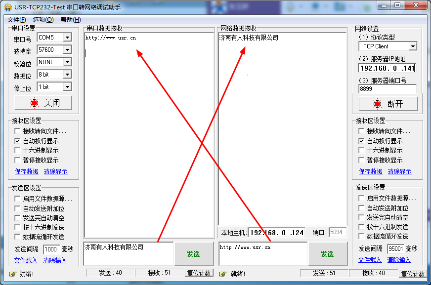 模塊串口數(shù)據(jù)發(fā)送到網(wǎng)絡(luò)端,網(wǎng)絡(luò)端發(fā)送數(shù)據(jù)到模塊串口端