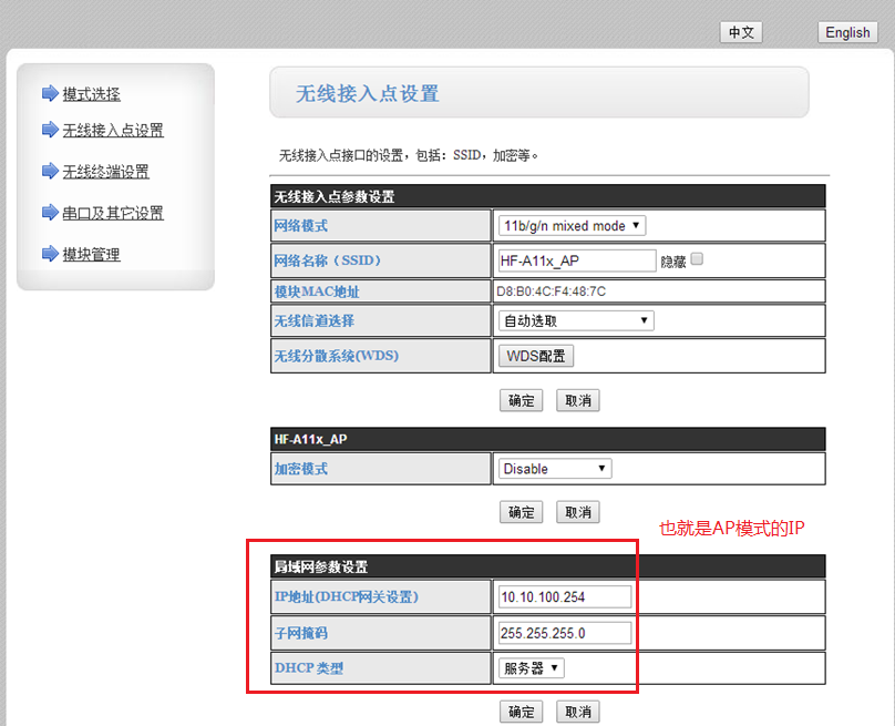 WiFi模塊LAN口IP地址為模塊AP模式的IP地址:局域網(wǎng)參數(shù)的IP為10.10.100.254.