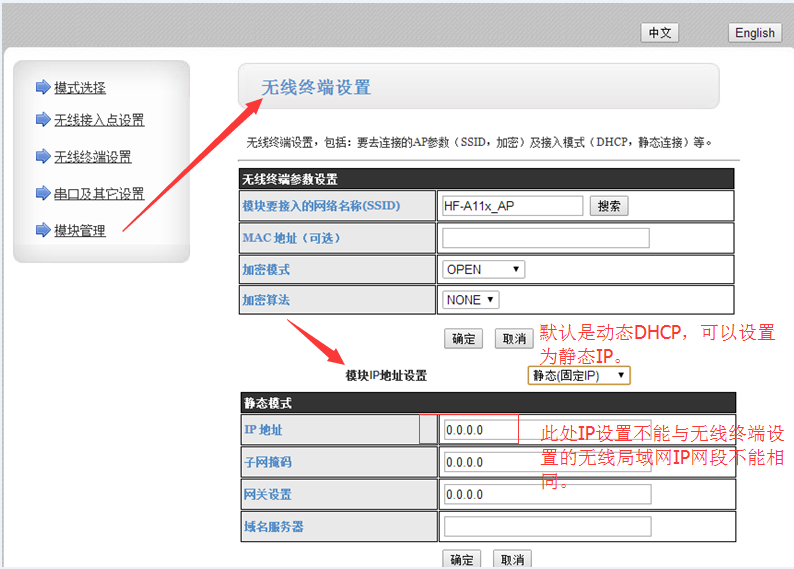 模塊無線終端設(shè)置的靜態(tài)IP必須和模塊連接的路由器IP一個網(wǎng)段。