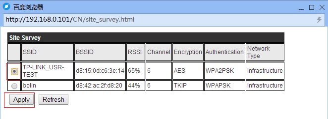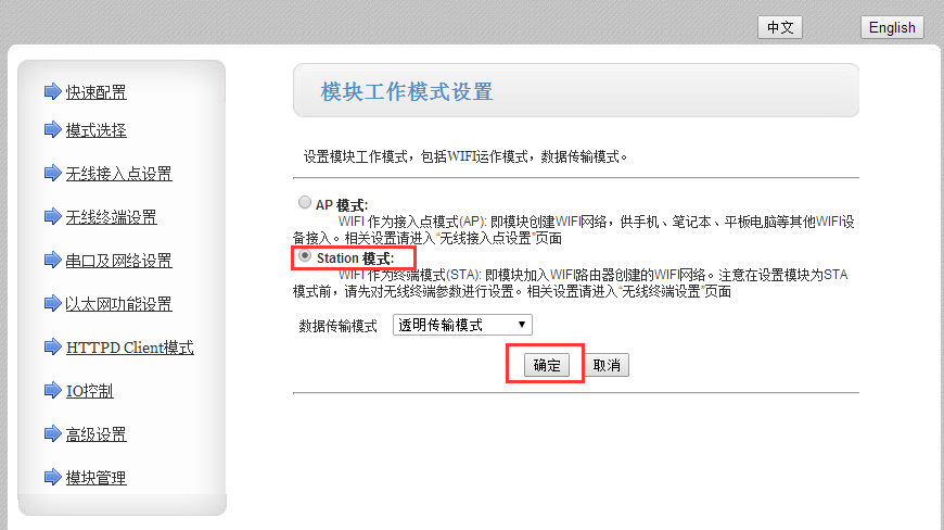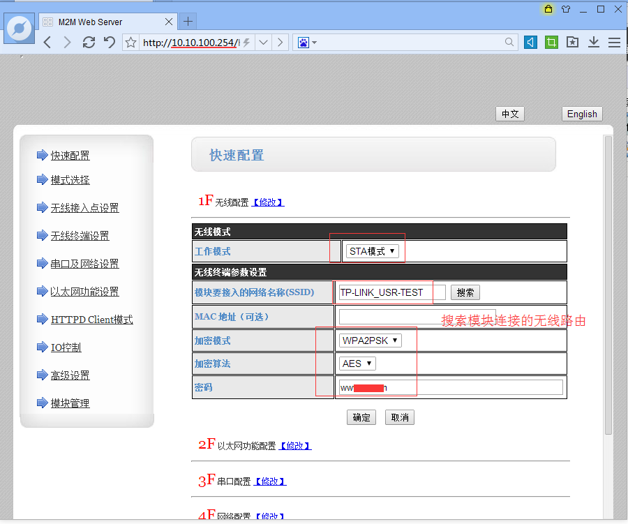 輸入WIFI模塊默認(rèn)的IP地址10.10.100.254進(jìn)入配置界面,快捷設(shè)置,設(shè)置為STA模式,然后搜索WiFi模塊要連接的路由器ssid,如果連接密碼。設(shè)置成功后在模塊管理內(nèi)重啟模塊。
