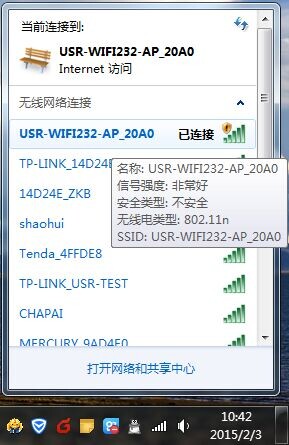 搜索網(wǎng)絡(luò),如下圖的USR-WIFI232-AP_XXXX即是模塊的默認(rèn)網(wǎng)絡(luò)名稱(ssid)。