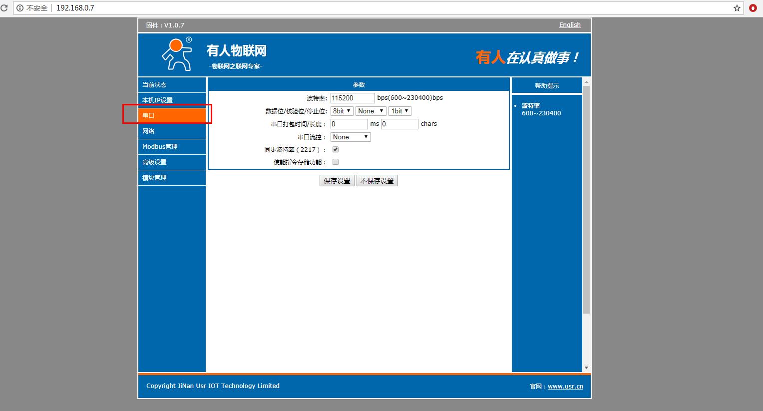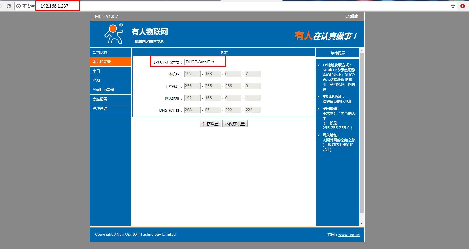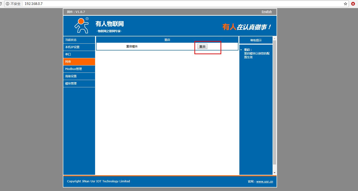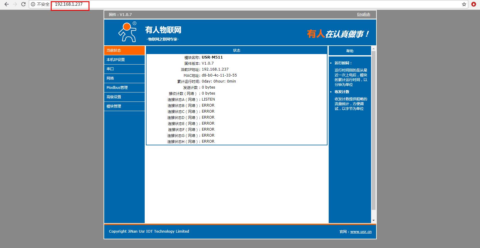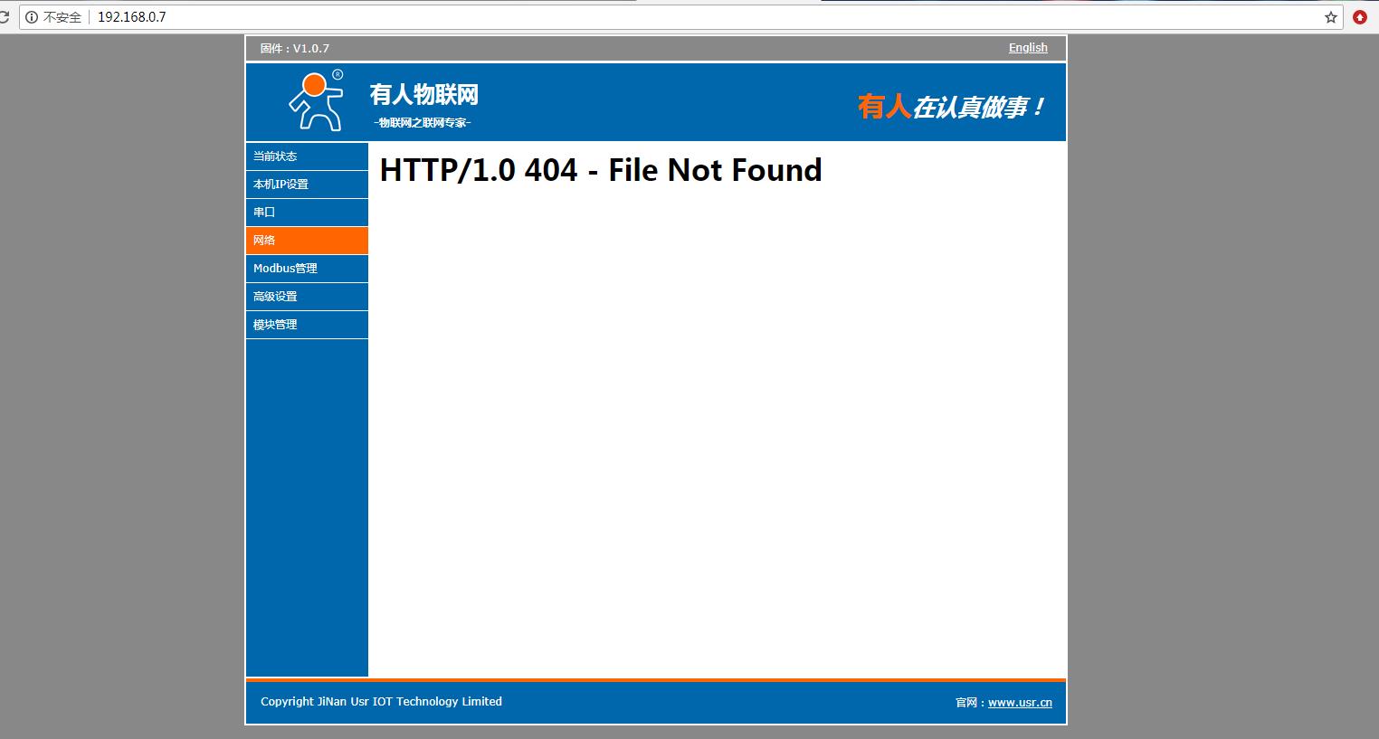 在電腦打開瀏覽器,輸入靜態IP192.168.0.7 登錄USR-M511的內置網頁。