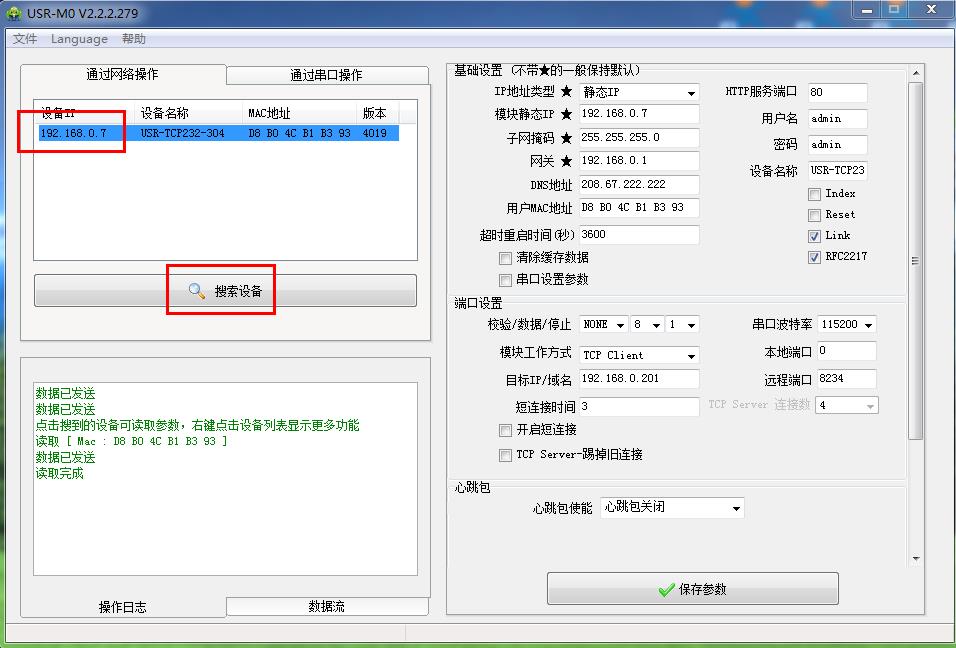 用M0設(shè)置軟件搜索USR-TCP232-304的IP。確認(rèn)是192.168.0.7
