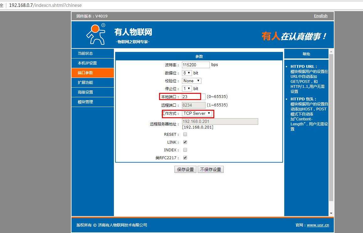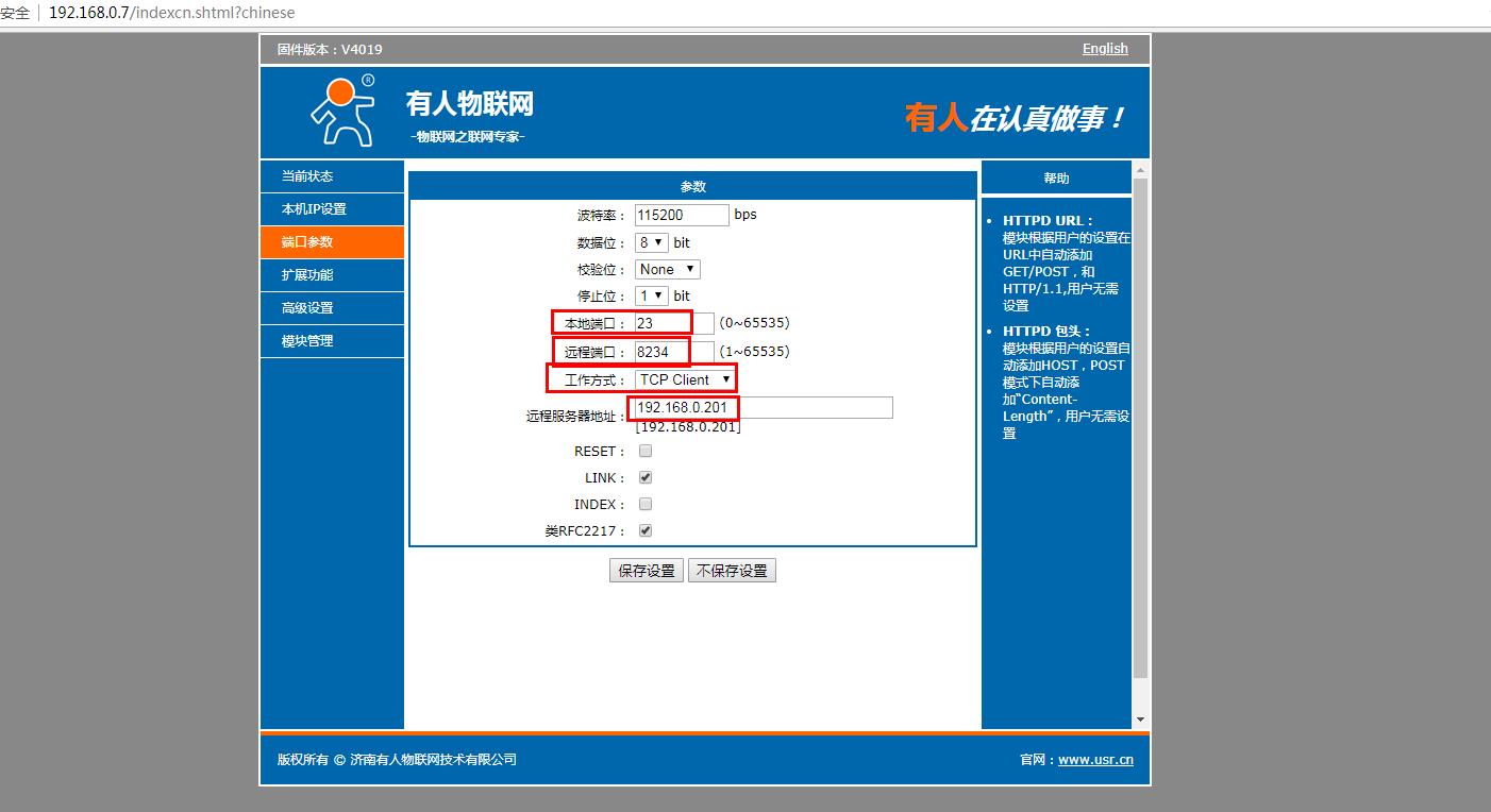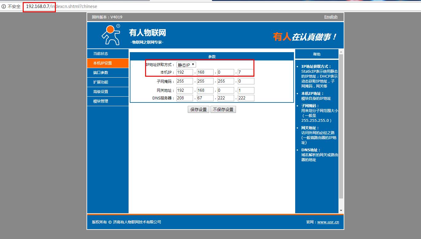 在電腦打開瀏覽器,輸入靜態(tài)IP192.168.0.7 登錄USR-TCP232-304的內(nèi)置網(wǎng)頁(yè)。