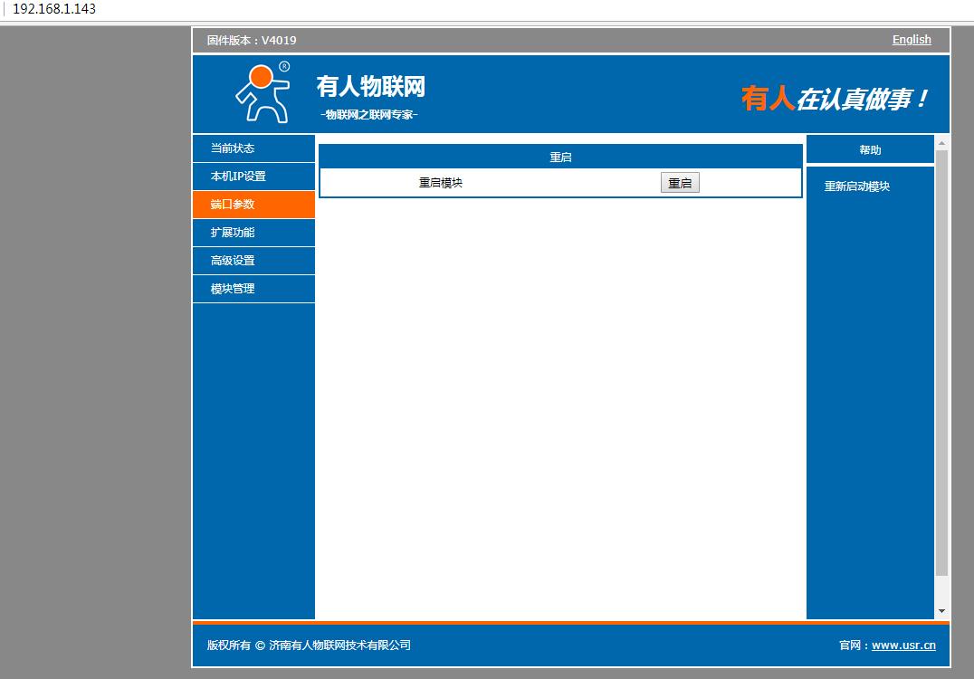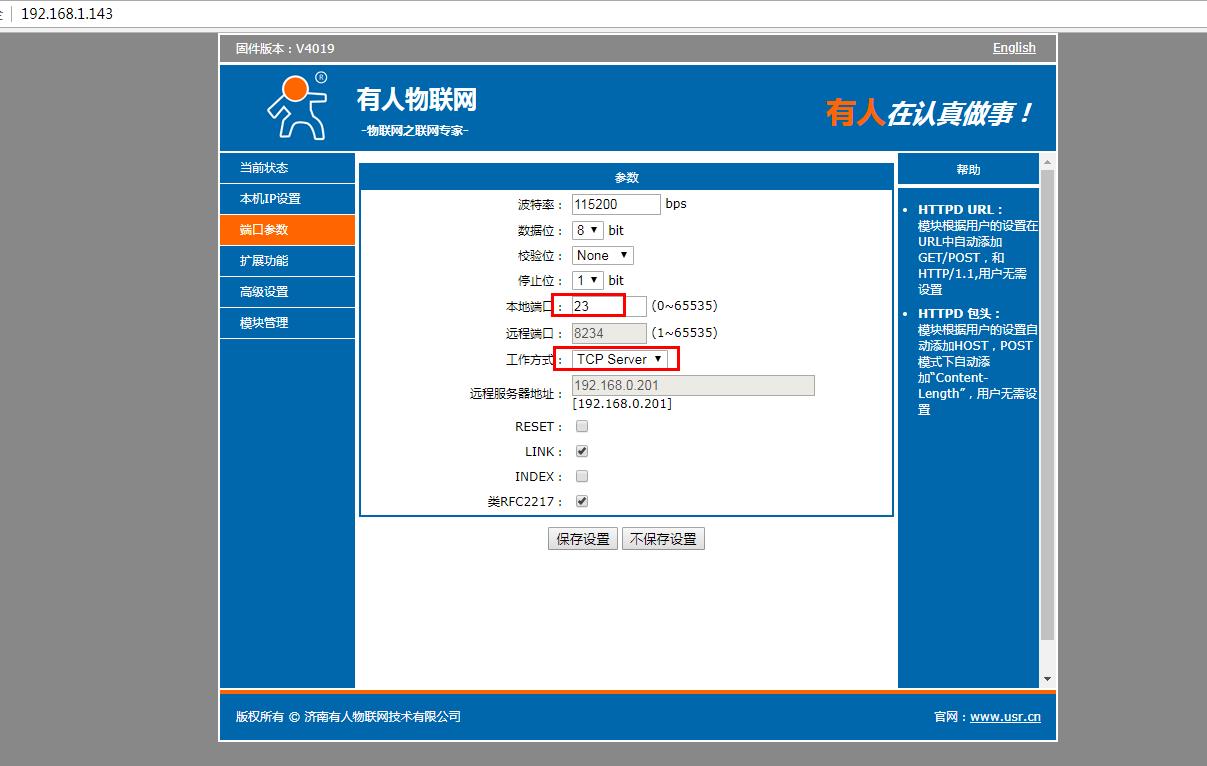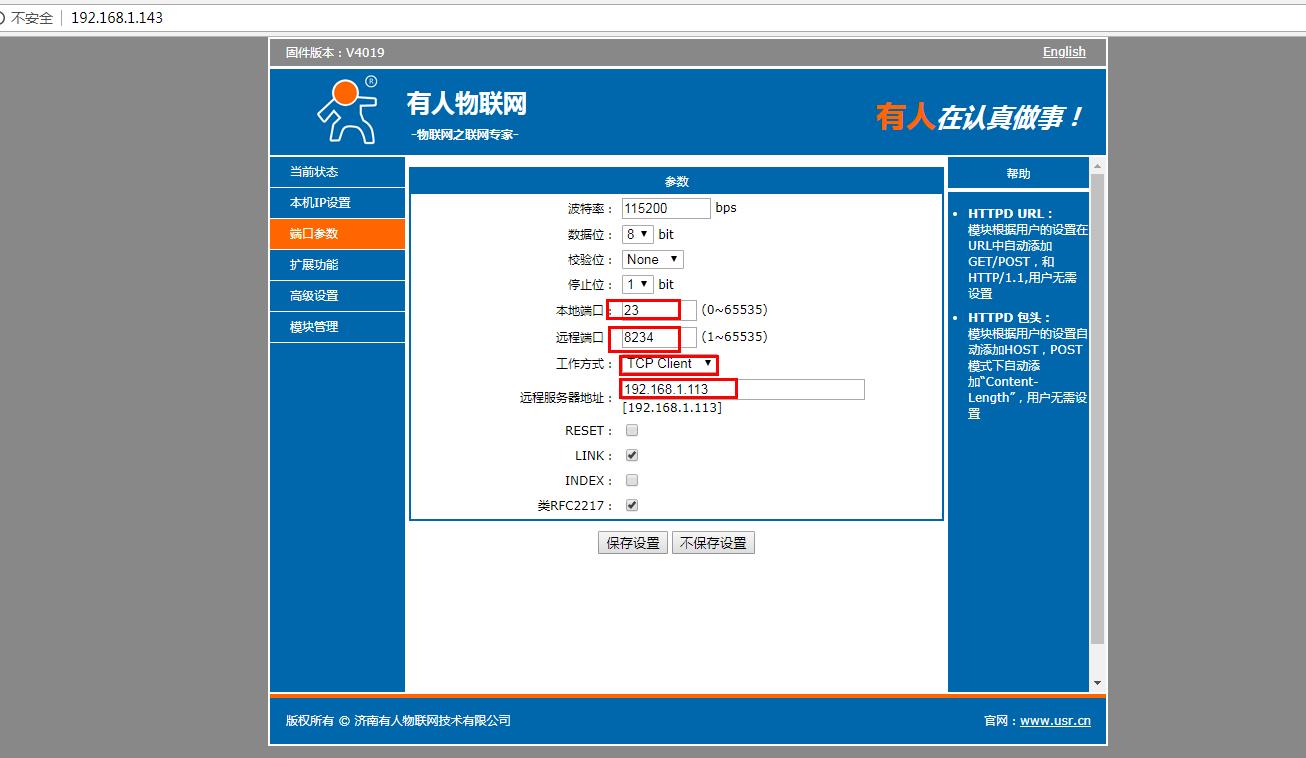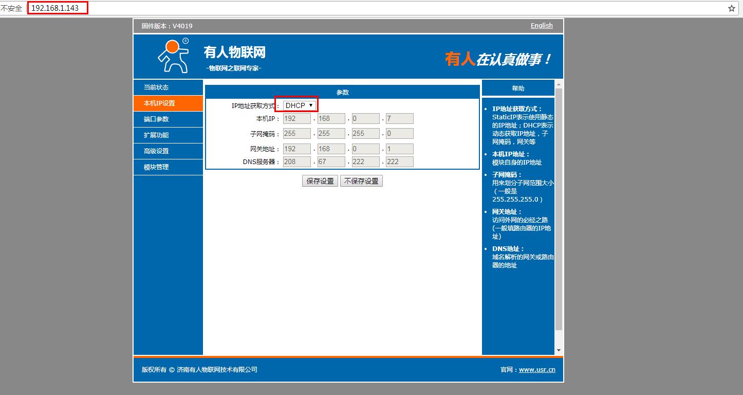 在電腦打開瀏覽器,輸入靜態(tài)IP192.168.1.143 登錄USR-TCP232-304的內(nèi)置網(wǎng)頁(yè)。