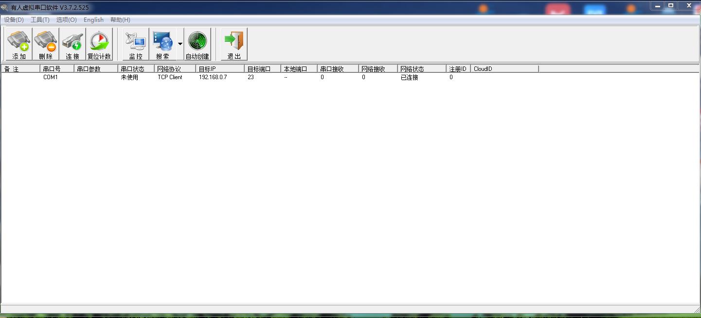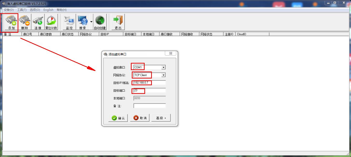 虛擬串口軟件手動(dòng)添加一個(gè)COM1,網(wǎng)絡(luò)協(xié)議設(shè)置TCP client,目標(biāo)IP填192.168.0.7,目標(biāo)端口填23。