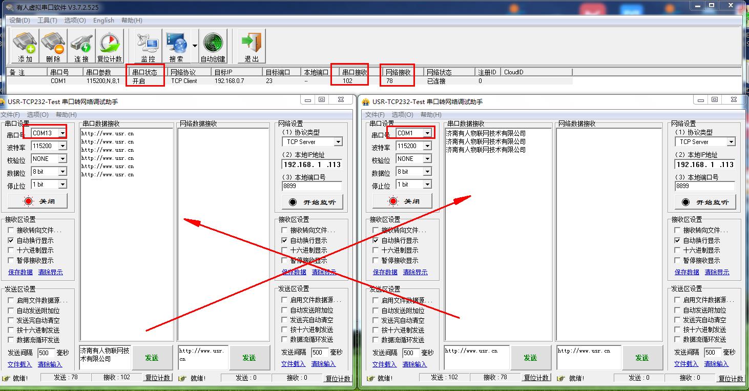 在電腦上,打開2個(gè)串口助手,USR-TCP232-TEST軟件。