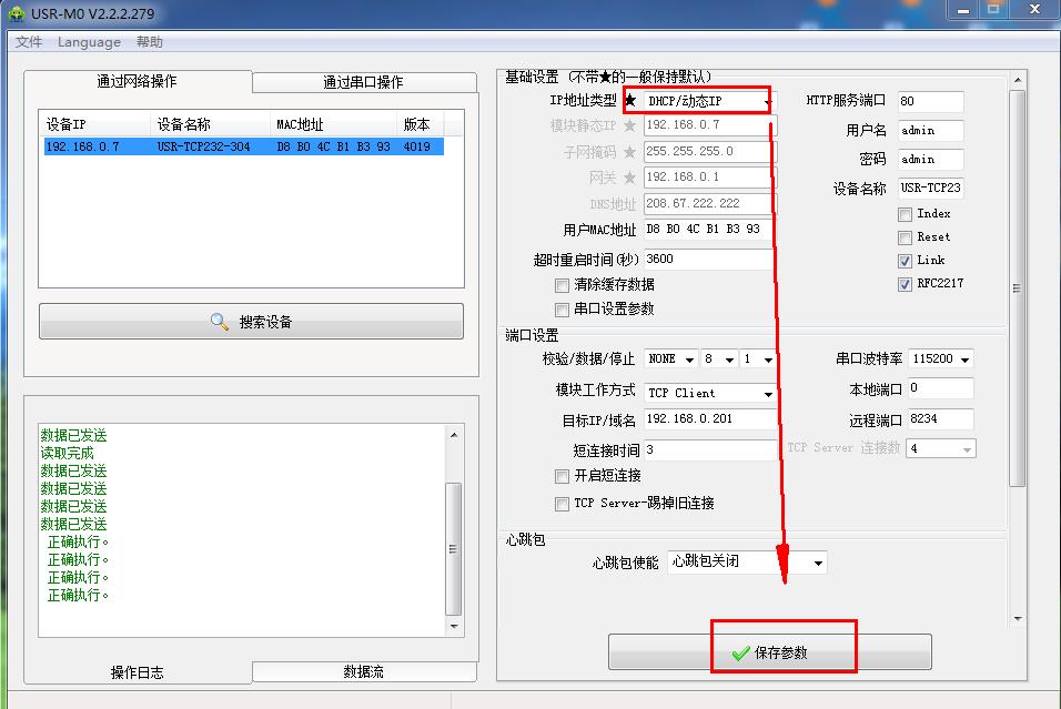 USR-TCP232-304網(wǎng)口用網(wǎng)線接路由器,電腦也連接同一個(gè)路由器。USR-TCP232-304用M4設(shè)置軟件設(shè)置DHCP,動(dòng)態(tài)獲取IP。